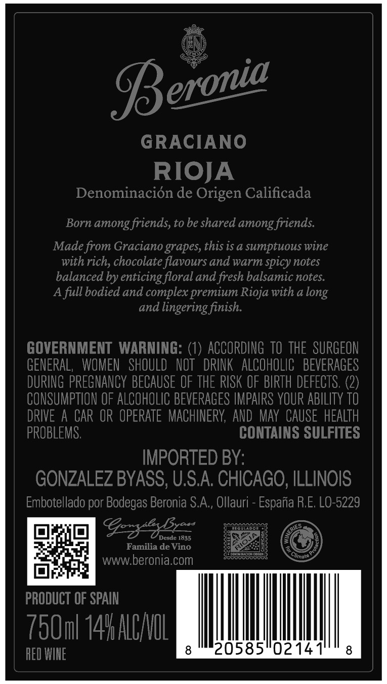 Beronia Graciano is an expressive Rioja crafted from 100% Graciano, offering deep picota cherry colour and intense aromas of black plum, violet and subtle spices. Elegant and vibrant, it shows fresh acidity, fine tannins and notes of chocolate and menthol, wrapped in well-integrated oak. A long, refined finish highlights the variety’s distinctive character.
