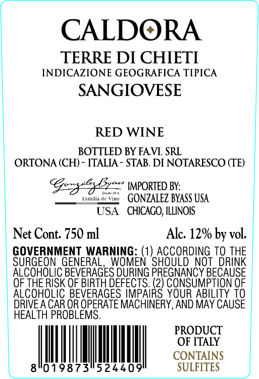 Caldora Sangiovese Terre di Chieti IGT is a fresh and approachable expression of Sangiovese from Abruzzo. Grown along the Adriatic coast, the grapes are hand harvested and gently vinified to preserve fruit purity. Ruby red in color, it shows vibrant aromas of strawberry and black cherry. On the palate it is medium-bodied, balanced and smooth, with soft tannins and a clean, persistent finish.