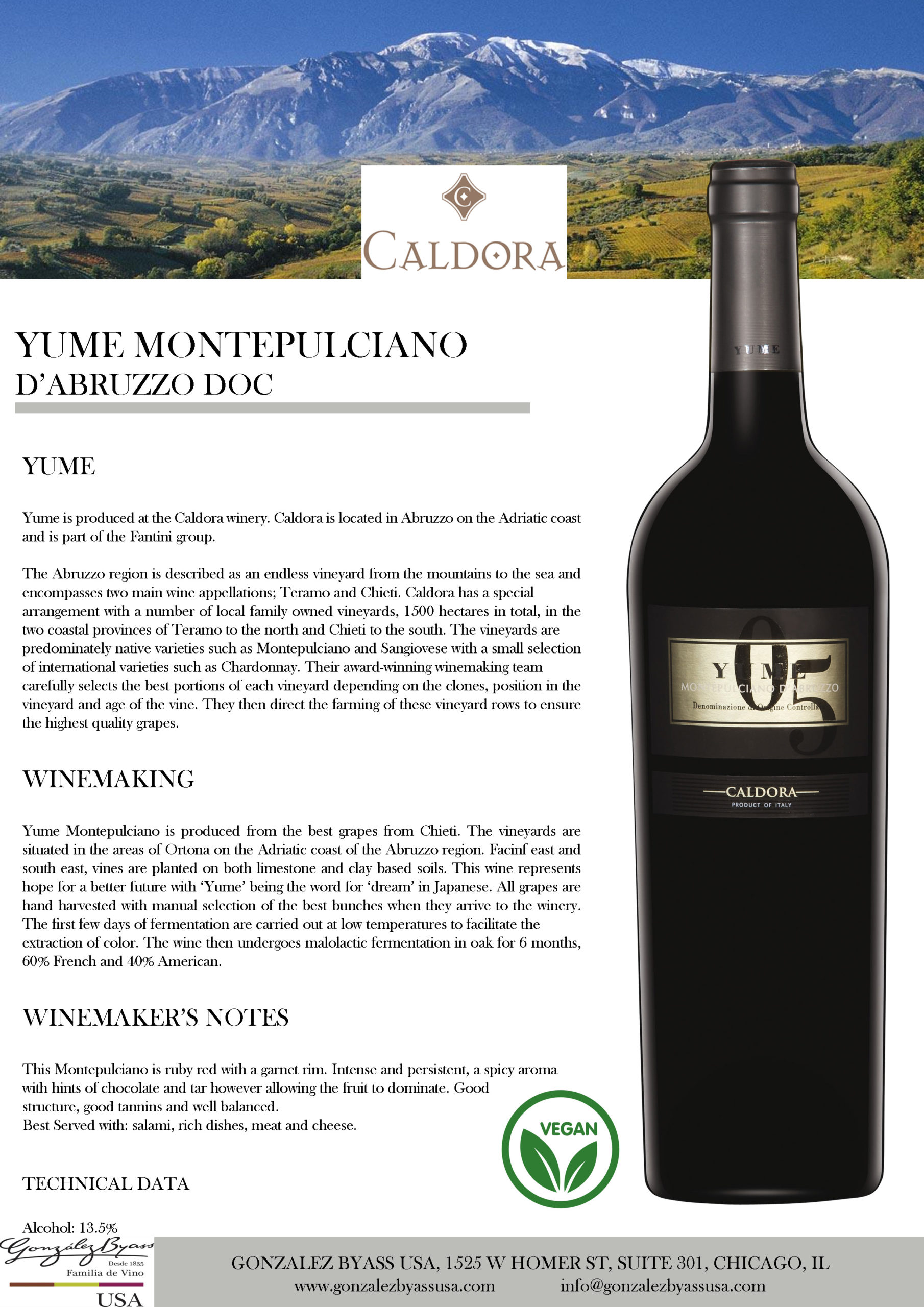 Yume Montepulciano d’Abruzzo DOC is a refined and expressive wine from the Adriatic slopes of Abruzzo. Hand harvested grapes from Chieti are gently vinified to preserve depth and elegance. After fermentation, the wine undergoes malolactic fermentation in oak for six months, adding structure and complexity. Ruby red with garnet hues, it shows spicy notes with hints of chocolate and tar, balanced by ripe fruit and smooth tannins.