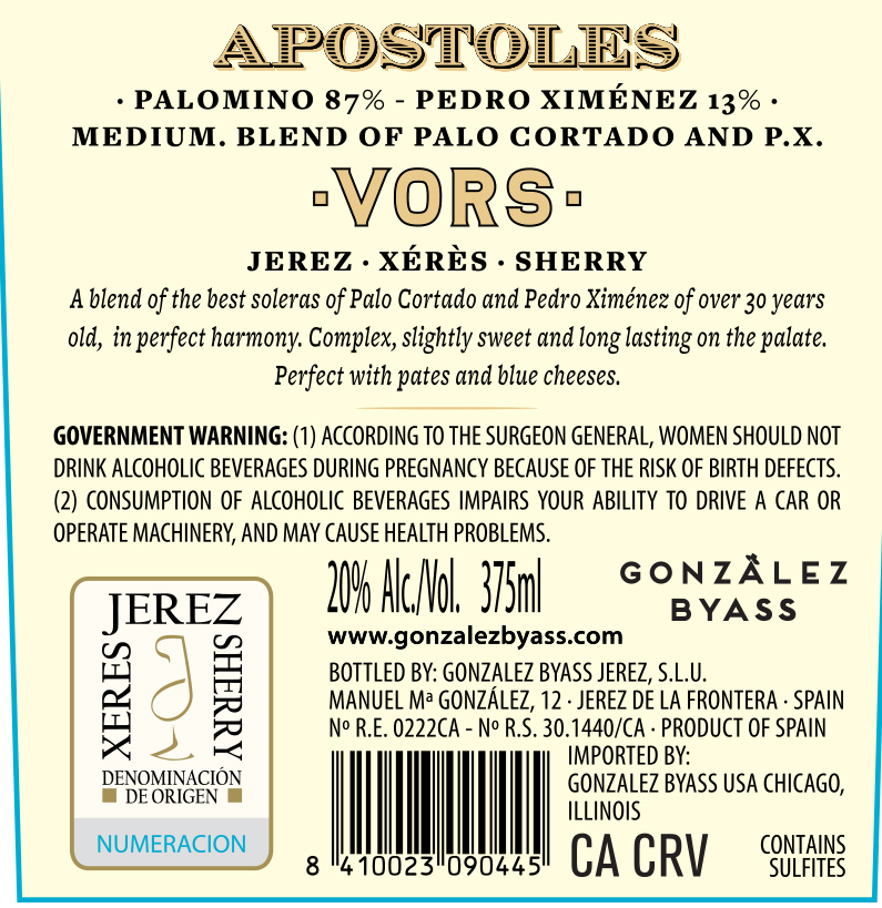 Apostoles VORS is a unique 30-year-old Palo Cortado blending Palomino and Pedro Ximénez. Aged in American oak, it reveals amber tones, delicate oxidative notes, and layers of nuts, caramel and dried fruit. Complex yet smooth, it is best enjoyed slightly chilled with foie gras or mature cheeses.