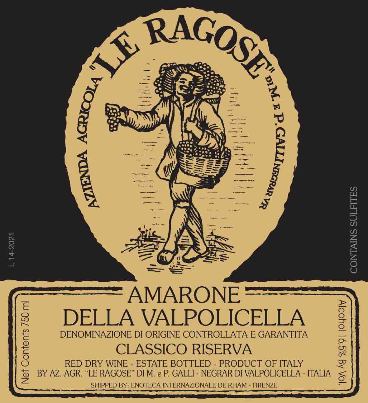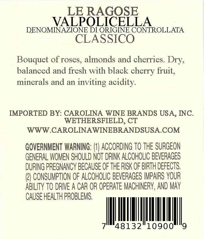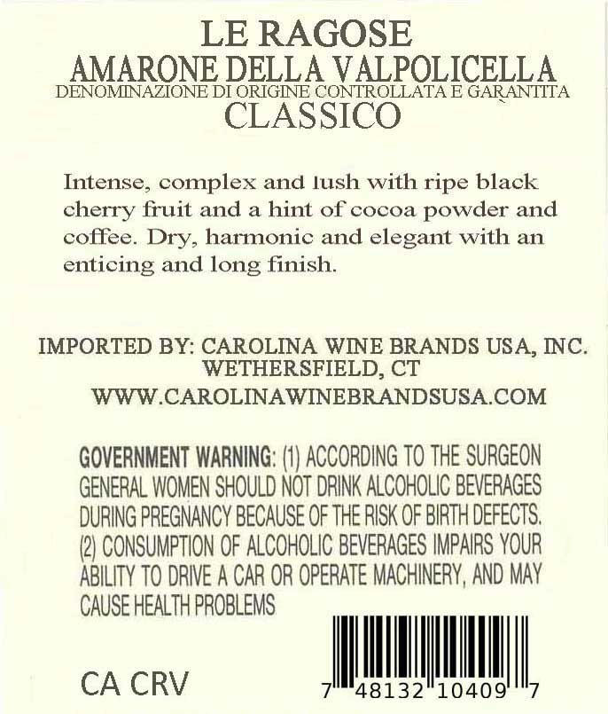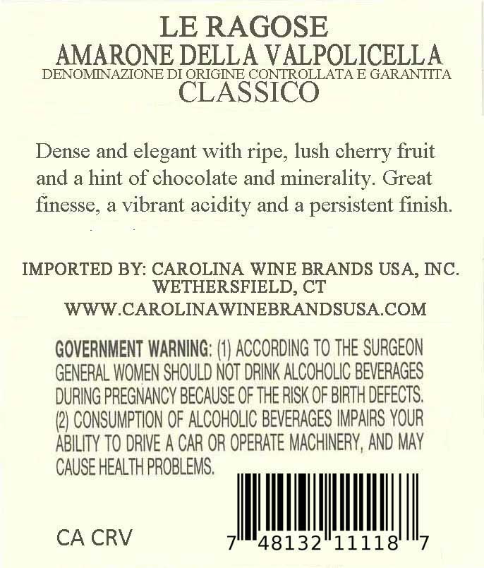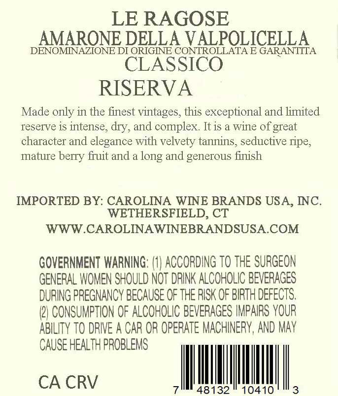 Le Ragose Amarone della Valpolicella Classico Riserva is produced only in exceptional vintages from a special selection of estate-grown grapes. Made using traditional appassimento and long aging in large Slavonian oak casks, it shows intense aromas of black cherry, currant, cocoa and coffee. Powerful yet refined, with deep concentration, vibrant acidity and remarkable balance, it delivers a long, persistent finish and outstanding aging potential.