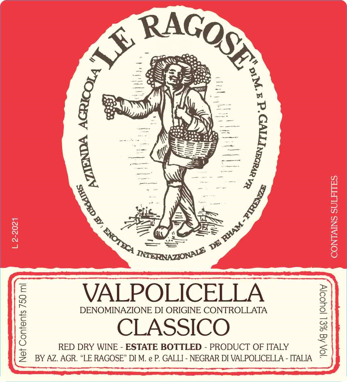 Le Ragose Valpolicella Classico DOC is produced in the hills of Negrar, at the highest point of Valpolicella Classica. A blend led by Corvina, Corvinone and Rondinella, complemented by rare local varieties, it reflects a historic vineyard heritage. Fresh red fruits, bright acidity and fine tannins define a balanced, vibrant wine, with a subtle mineral backbone and exceptional drinkability rooted in terroir.
