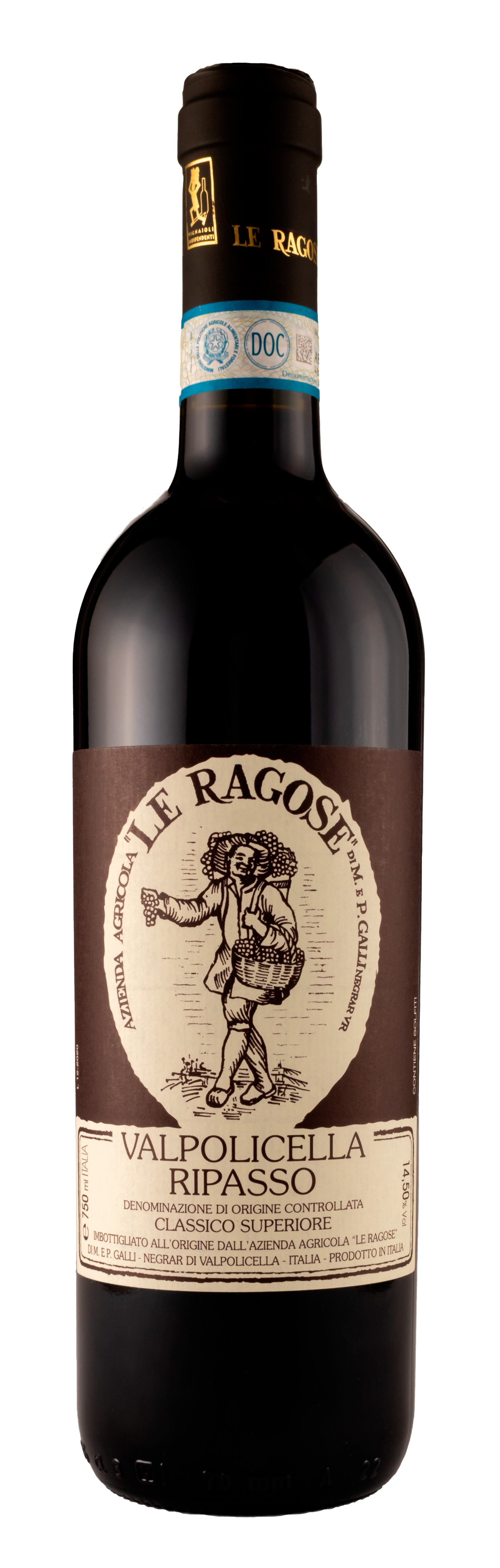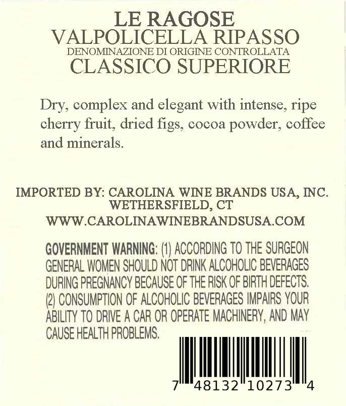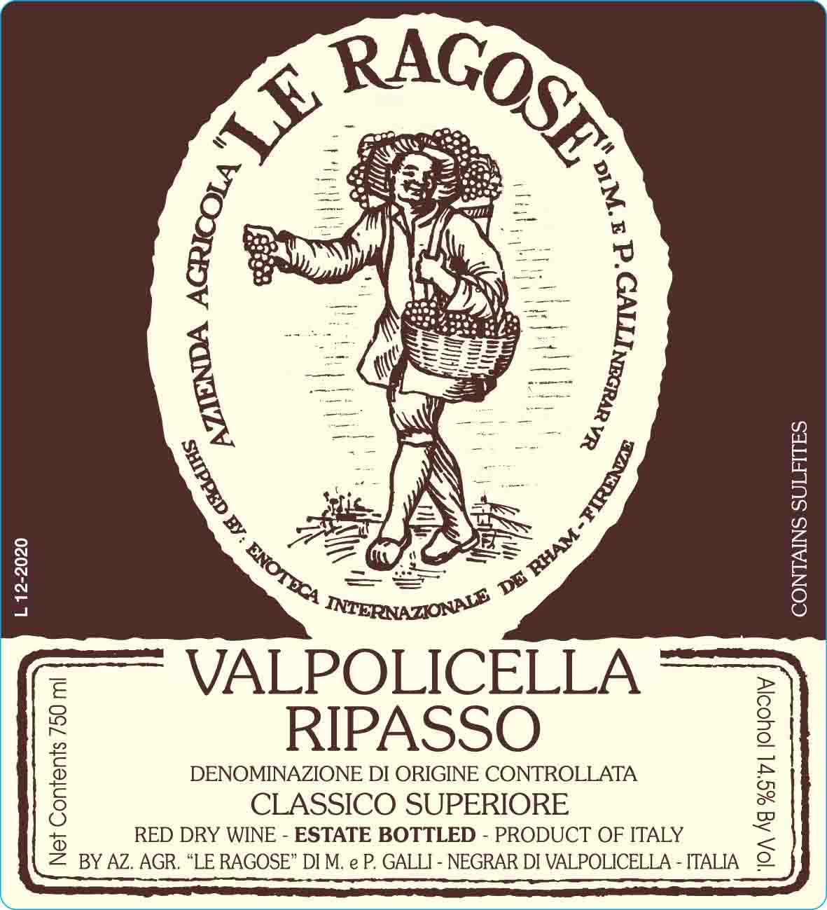Le Ragose Ripasso Valpolicella Classico Superiore DOC is crafted in the hills of Negrar using traditional Valpolicella grapes and the historic Ripasso method on Amarone lees. This process adds depth and complexity while preserving freshness and balance. Aromas of ripe black cherry, dried figs and sweet spices lead to a rich, structured palate, with mineral nuances, polished tannins and a long, persistent finish.