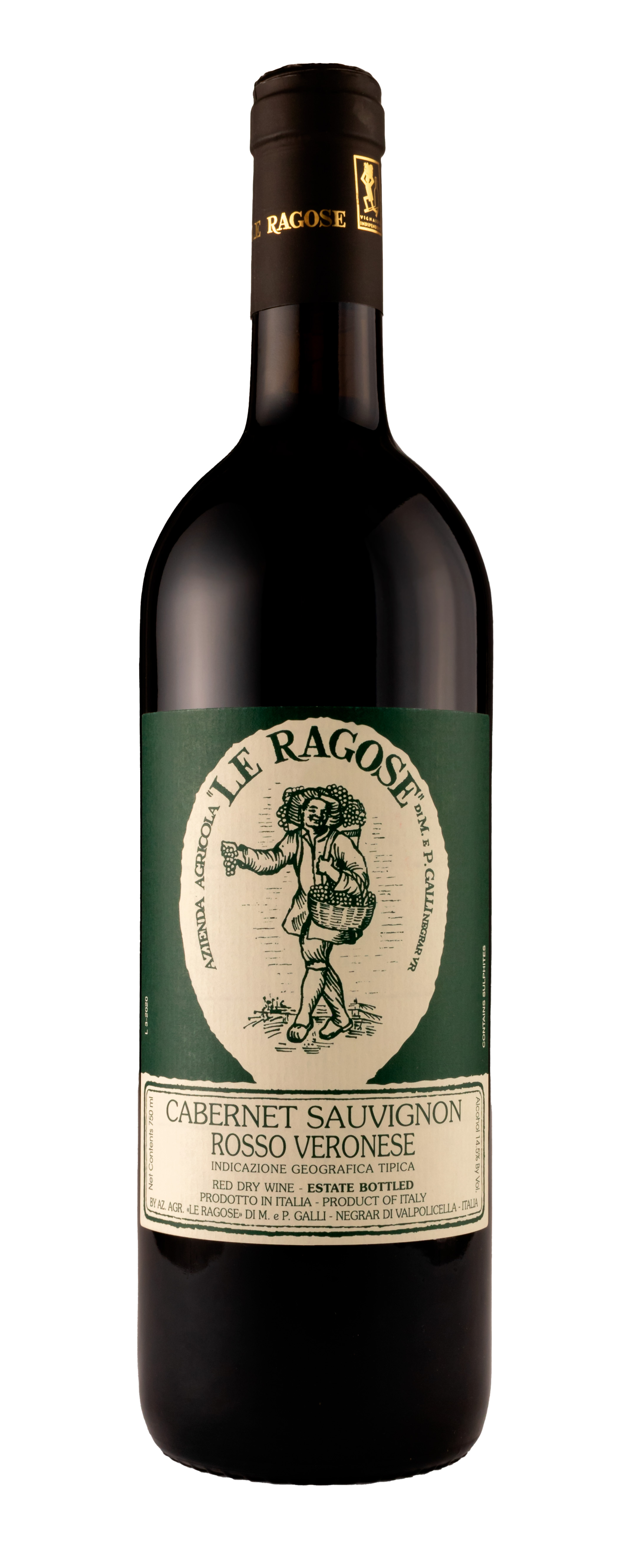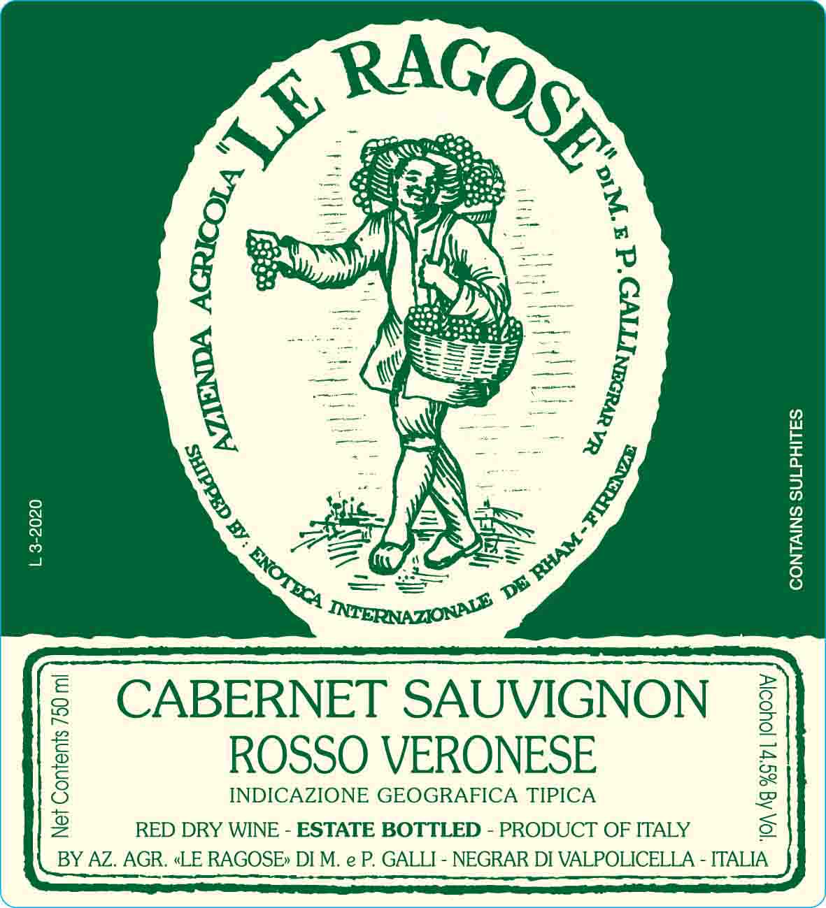 Le Ragose Rosso Veronese Cabernet Sauvignon is produced from 100% Cabernet Sauvignon grown at 300 meters above sea level on clay soils rich in magnesium, calcium and iron. Hand-harvested in September, it ferments in stainless steel with indigenous yeasts and ages for two years in Tronçais and Allier oak. Deep ruby in color, it offers aromas of cassis, dark berries, cedar and cocoa, with a structured palate and long, persistent finish.