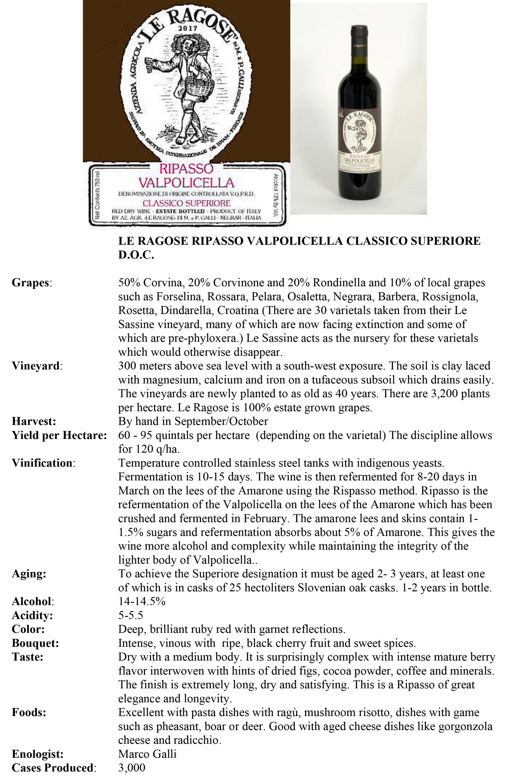 Le Ragose was purchased in 1969 by an oenologist named Arnaldo Galli and his wife Marta. Due to the high elevation, Marta recognized the need for a separate designation for the hills to distinguish them from the valley flat land.