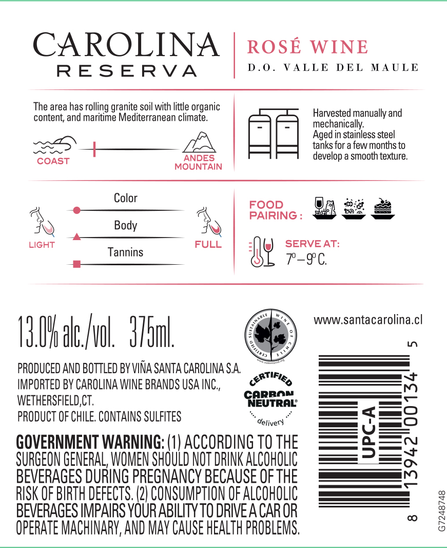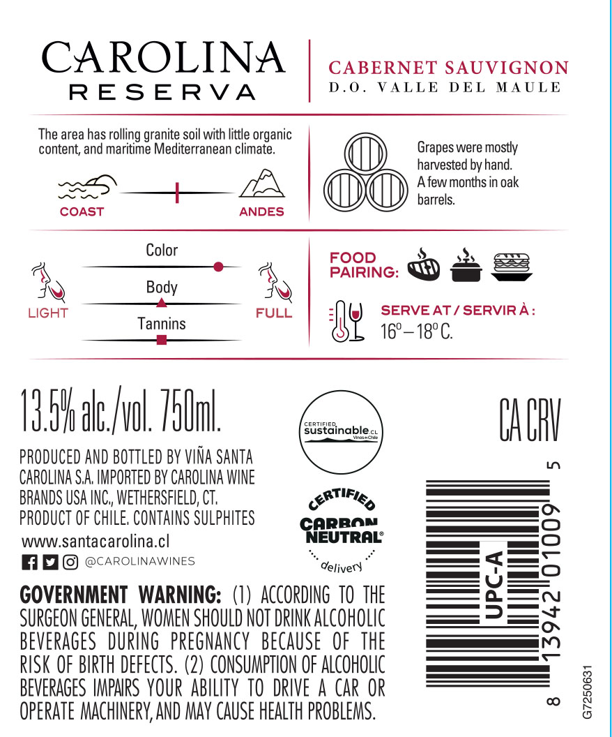 Carolina Reserva Cabernet Sauvignon reflects the depth and character of Chile’s Maule Valley, where diverse soils and a Mediterranean climate shape expressive, elegant wines. Hand-harvested grapes are vinified with care to preserve purity and structure, resulting in a wine of deep violet color and intense aromas of red fruits, black pepper and cedar. On the palate, it is balanced and smooth, with ripe tannins, subtle oak notes and a long, refined finish.