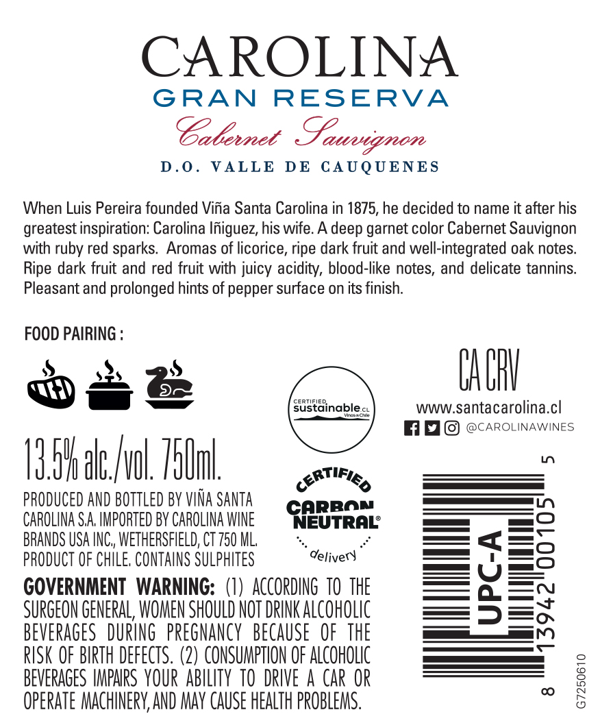 Carolina Gran Reserva Cabernet Sauvignon expresses the depth and character of Chile’s Maule Valley, where warm days and cool influences shape a wine of intensity and balance. Deep garnet in color, it offers aromas of ripe dark fruit, licorice and subtle oak. The palate is full-bodied and structured, with juicy acidity, firm yet elegant tannins and notes of blackcurrant, spice and cedar. Carefully aged to enhance complexity, it finishes long and refined, ideal for pairing with rich meats and savory dishes.