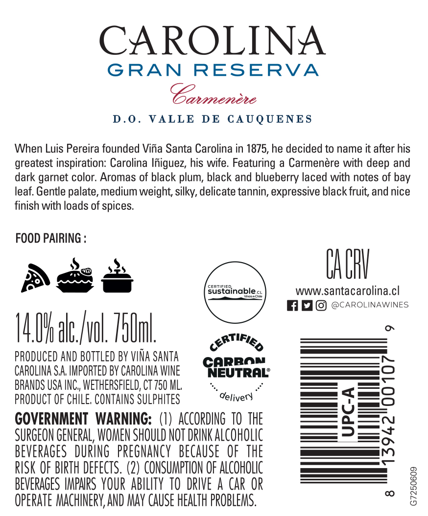 Carolina Gran Reserva Carménère expresses the depth and character of Chile’s dry-farmed inland valleys. Sourced from selected vineyards, it reveals a deep violet color and aromas of ripe black fruit, plum and cherry, layered with notes of tobacco leaf, dark chocolate and sweet spices. On the palate it is juicy and well-structured, with polished tannins, balanced acidity and a persistent, mineral-driven finish that reflects its origin and careful aging.