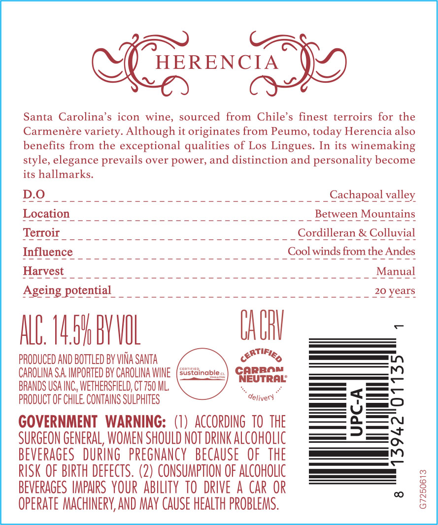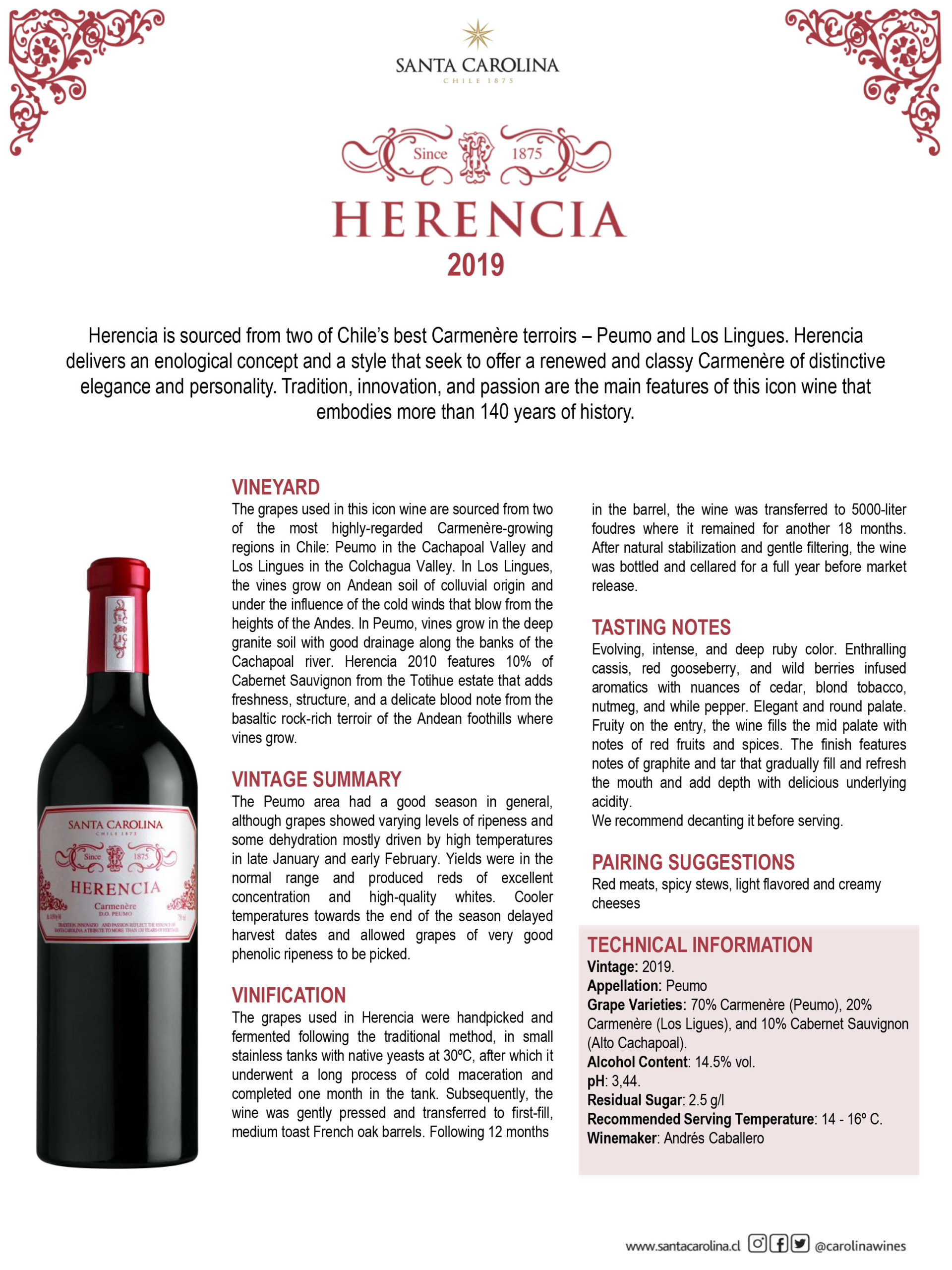 Sourced from two of Chile’s most renowned Carménère terroirs, Peumo and Los Lingues, Herencia 2019 embodies a refined and contemporary expression of this iconic variety. Deep ruby in color, it reveals intense aromas of cassis, red gooseberry and wild berries, layered with notes of cedar, blond tobacco and spice. Elegant and structured, the palate is rich yet balanced, finishing long and vibrant with remarkable depth and freshness.