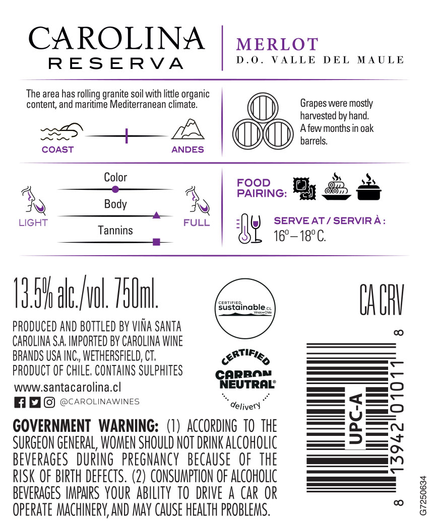 Carolina Reserva Merlot expresses the character of the Maule Valley through a bright ruby-red color and a refined, fruit-driven profile. Aromas of raspberry and sour cherry lead the nose, followed by subtle notes of sweet spices, cinnamon and tobacco. On the palate, it is smooth and well-balanced, with fresh acidity and gentle yet firm tannins that deliver a lingering, elegant finish.