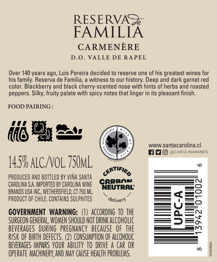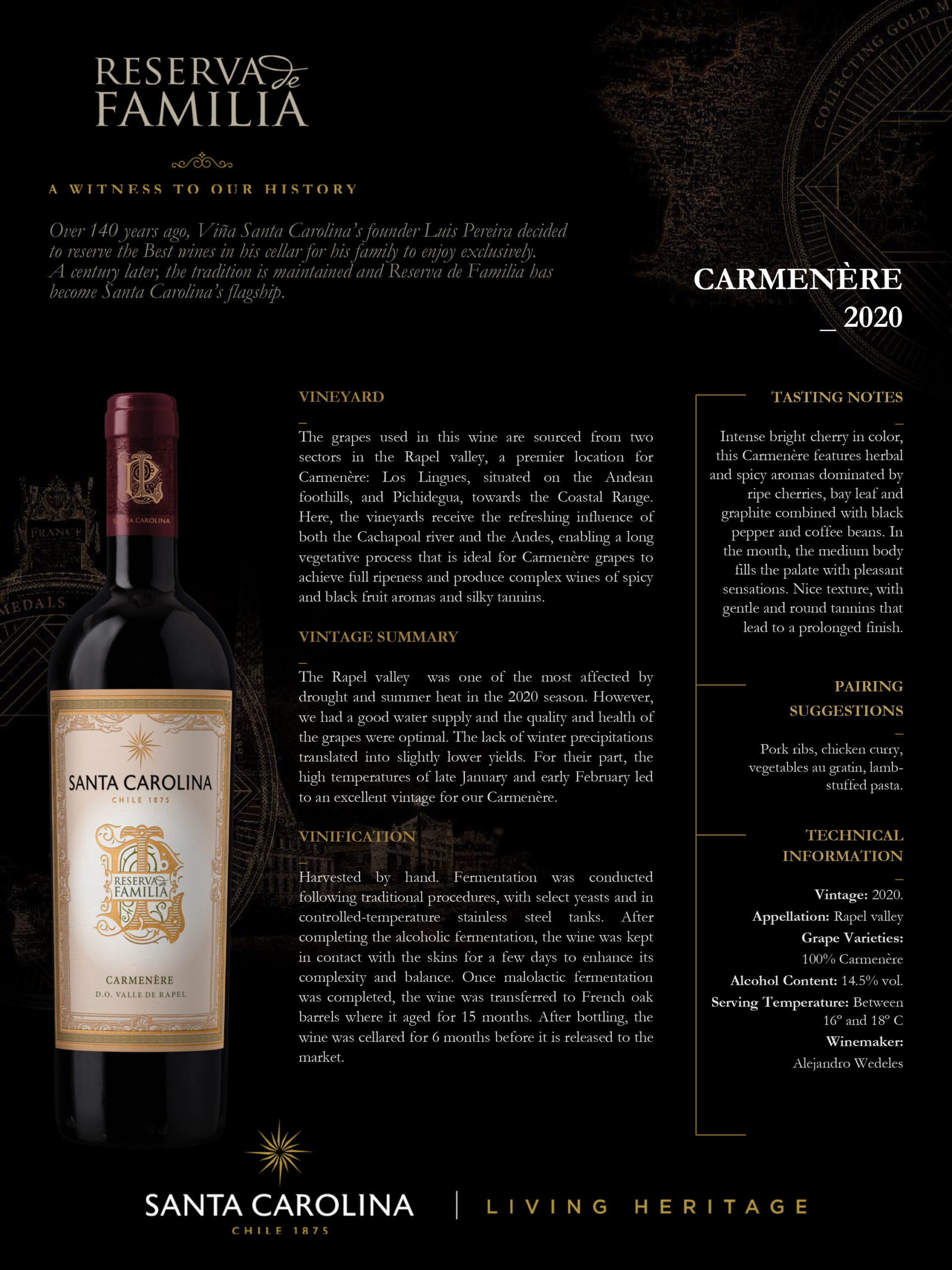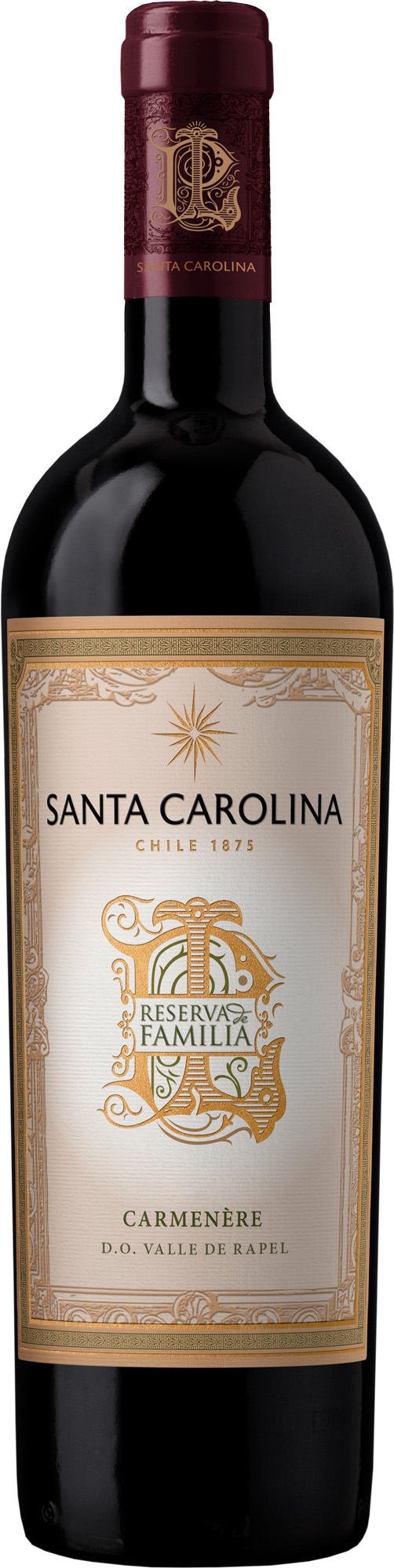 Reserva de Familia Carmenère is a tribute to Santa Carolina’s heritage and winemaking tradition. Sourced from selected vineyards in the Rapel Valley, this wine shows intense aromas of ripe cherry, herbs and spice, with notes of bay leaf, black pepper and coffee. The palate is medium-bodied and silky, with rounded tannins, balanced structure and a long, elegant finish shaped by careful oak aging.