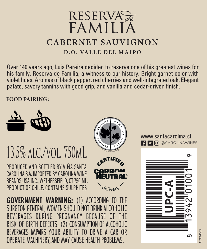 Born from a tradition begun over 140 years ago, Reserva de Familia Cabernet Sauvignon represents the finest expression of Santa Carolina’s heritage. Crafted from selected vineyards and aged with patience, this wine reveals deep ruby color, layered aromas of ripe dark fruit, herbs and subtle spice. Structured yet elegant, it offers silky tannins, depth and a long, memorable finish that honors generations of winemaking excellence.