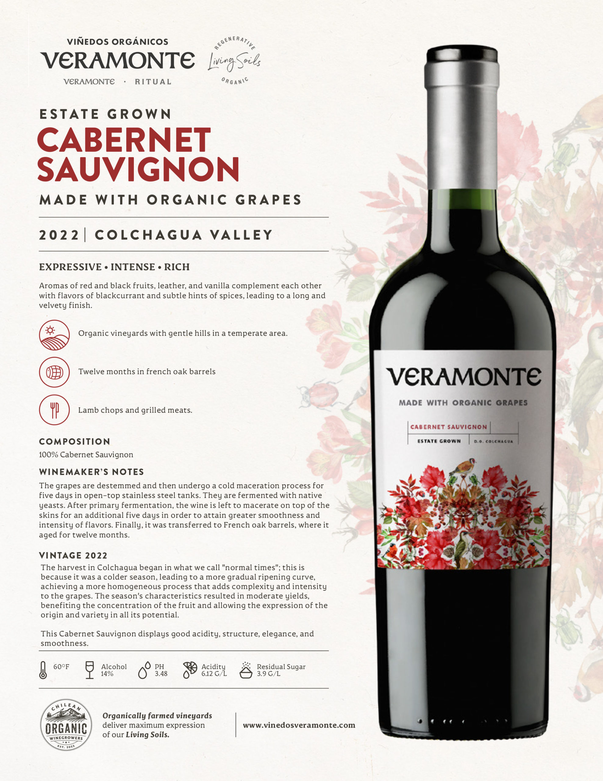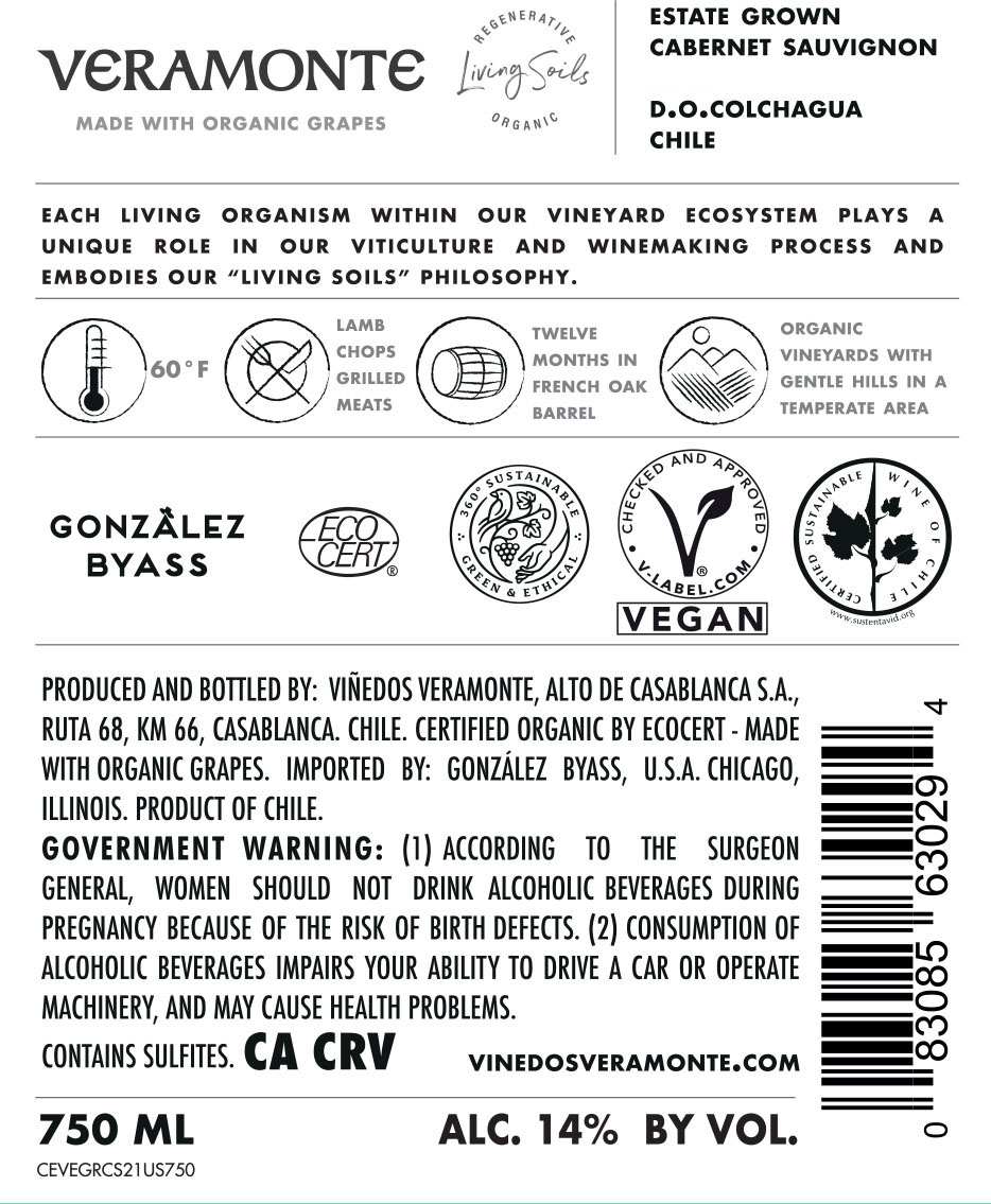 Veramonte Estate Grown Cabernet Sauvignon is an organic wine from the Colchagua Valley, known for its depth and intensity. Aromas of red and black fruits intertwine with notes of leather, vanilla and subtle spice. Full-bodied and rich, it offers good structure, balanced acidity and velvety tannins, finishing long and smooth with a refined, expressive character.