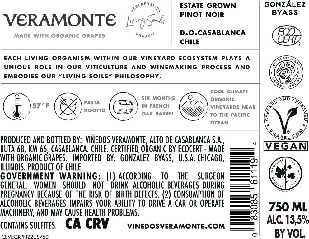 Veramonte Estate Grown Pinot Noir is an organic wine from the cool Casablanca Valley, defined by purity and finesse. Aromas of raspberries, red cherries and strawberries lead to a fresh, delicate palate with silky tannins and balanced acidity. Light oak aging adds subtle structure, enhancing a smooth texture and an elegant, lingering finish that reflects its coastal origin.