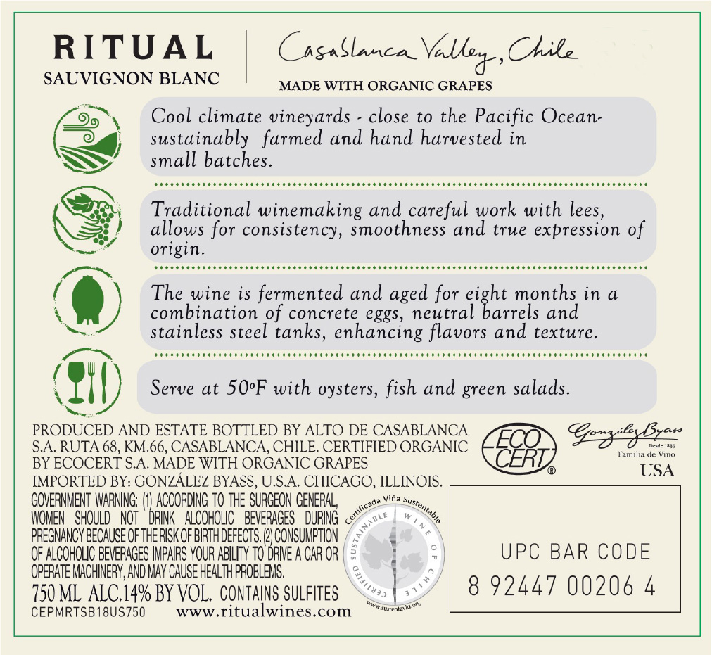 Ritual Sauvignon Blanc is an organic wine from the cool Casablanca Valley, shaped by coastal influence and granitic soils. Bright citrus and floral aromas blend with notes of white peach and nectarine. Fresh and vibrant, it shows well-integrated acidity, a smooth, rounded mouthfeel and a long, clean finish that highlights purity, balance and expressive freshness.