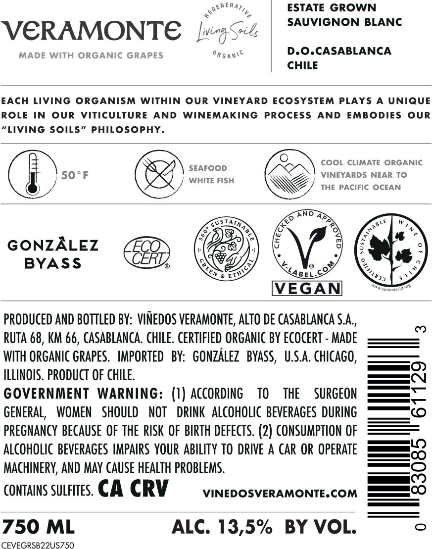 Veramonte Estate Grown Sauvignon Blanc is a vibrant organic wine from the Casablanca Valley, shaped by cool coastal influence. Aromas of citrus, white peach and fresh herbs are layered with subtle mineral notes. Crisp and refreshing, it offers bright acidity, a smooth mouthfeel and a long, persistent finish that highlights purity of fruit and expressive terroir.