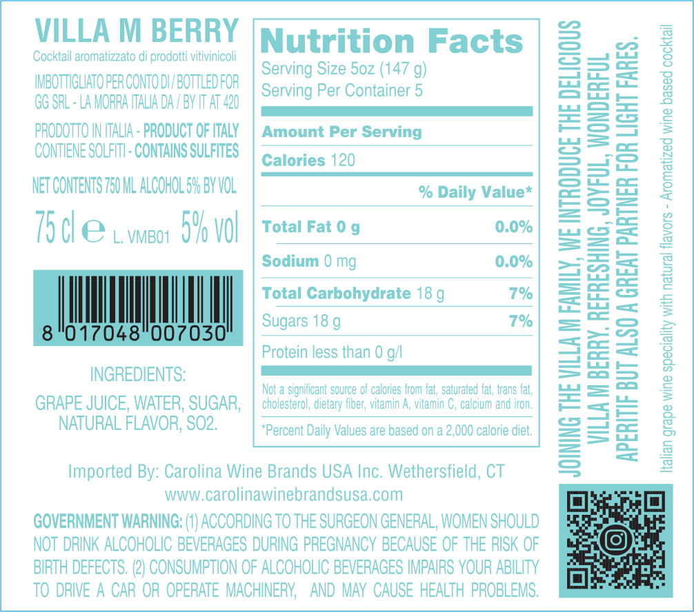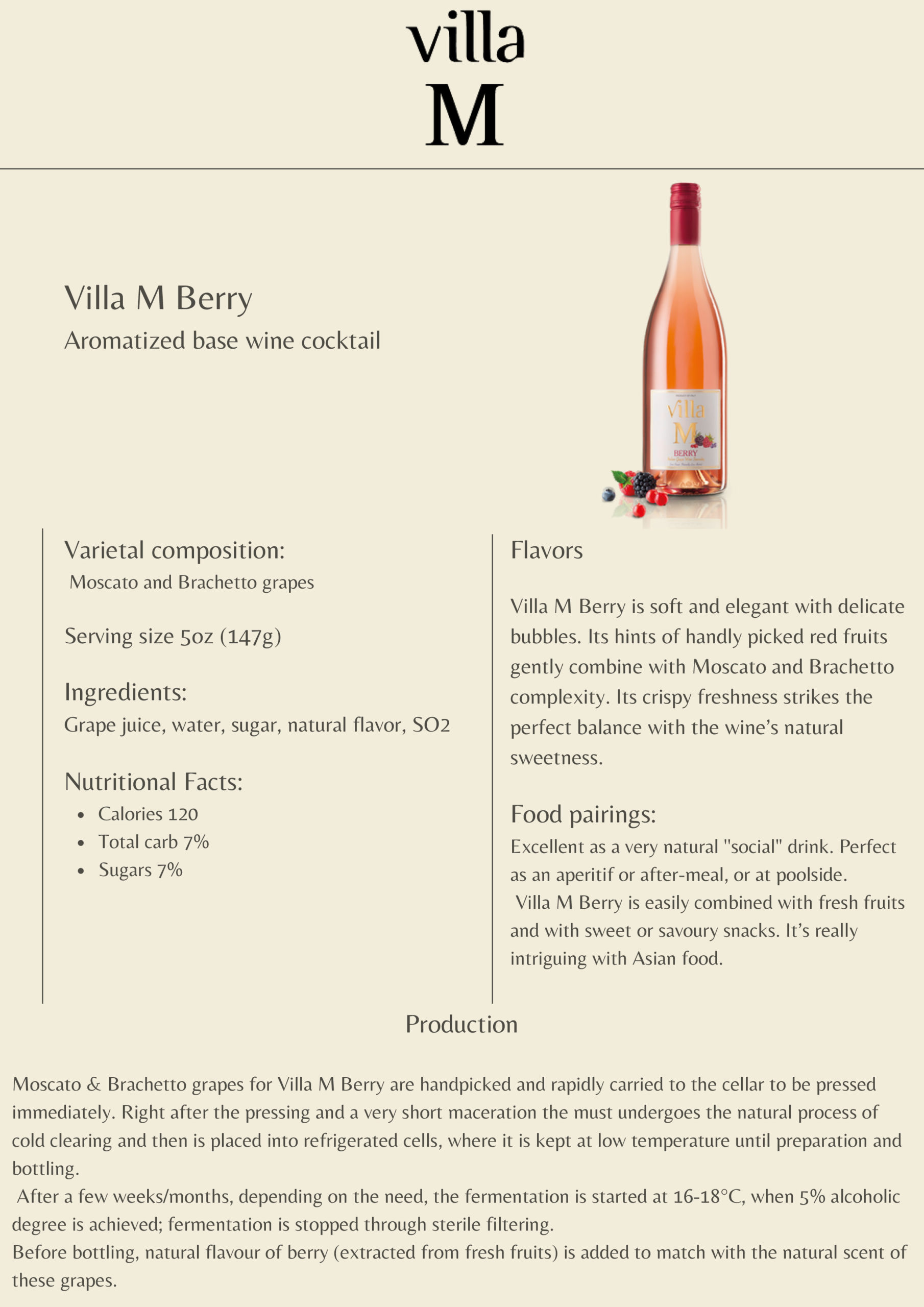 Villa M Berry is a vibrant and easy-drinking aromatized wine cocktail crafted from Moscato and Brachetto grapes. Delicate bubbles lift fresh notes of red berries, gently woven into the wine’s natural sweetness and aromatic complexity. Crisp, fruity and refreshing, it offers a perfect balance between softness and freshness, designed for relaxed social moments, aperitifs, after-meal sipping or poolside enjoyment.
