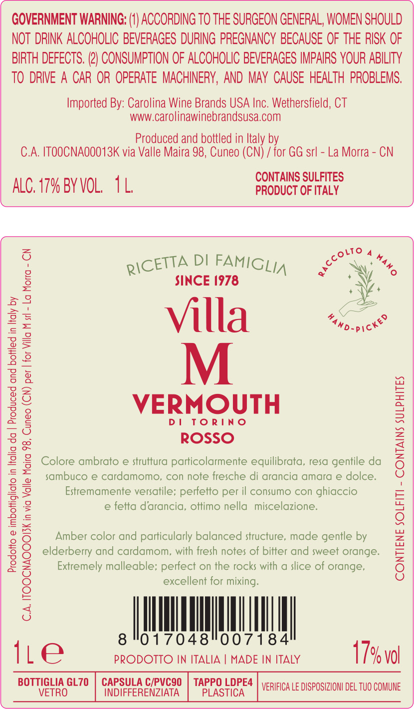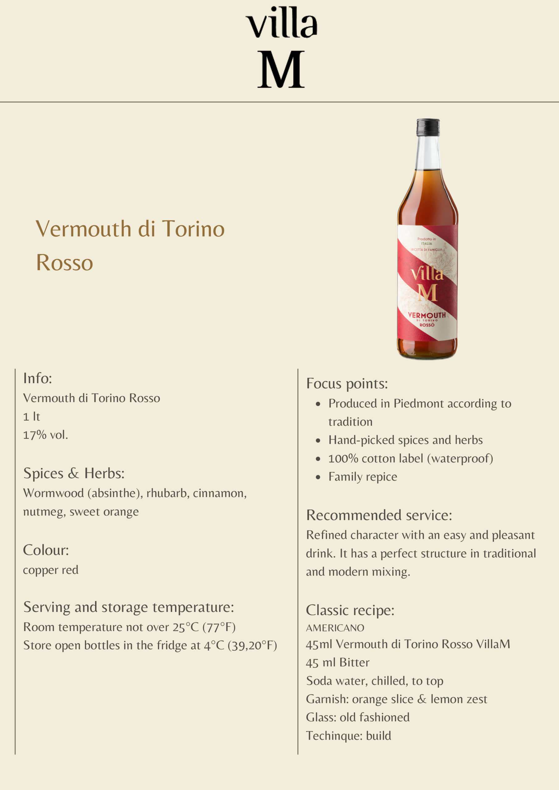 Villa M Vermouth di Torino Rosso is a refined expression of Piedmontese tradition, crafted following a family recipe with hand-picked herbs and spices. Notes of wormwood, rhubarb, cinnamon, nutmeg and sweet orange create a deep copper-red vermouth with elegant bitterness and warmth. Smooth, balanced and versatile, it shines both served neat and as a perfect base for classic or modern cocktails.