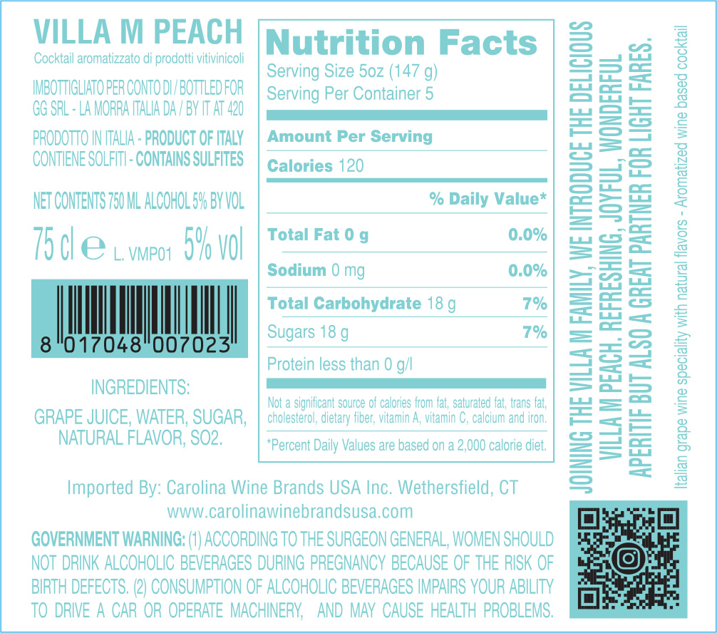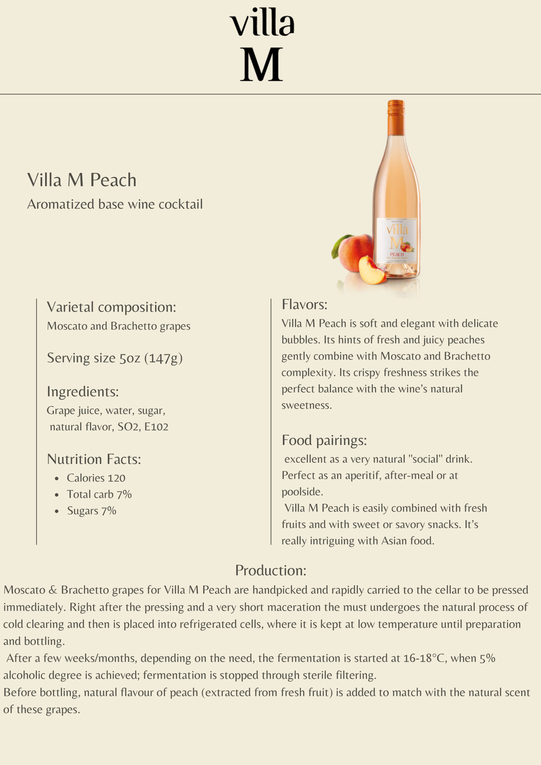 Villa M Peach is a fresh and playful aromatized wine cocktail made from Moscato and Brachetto grapes. Soft, elegant bubbles carry vibrant notes of juicy peach, perfectly integrated with the wine’s natural sweetness and crisp freshness. Light, aromatic and irresistibly smooth, it’s designed for easy enjoyment—social, refreshing and ideal for relaxed moments by the pool or as an aperitif.
