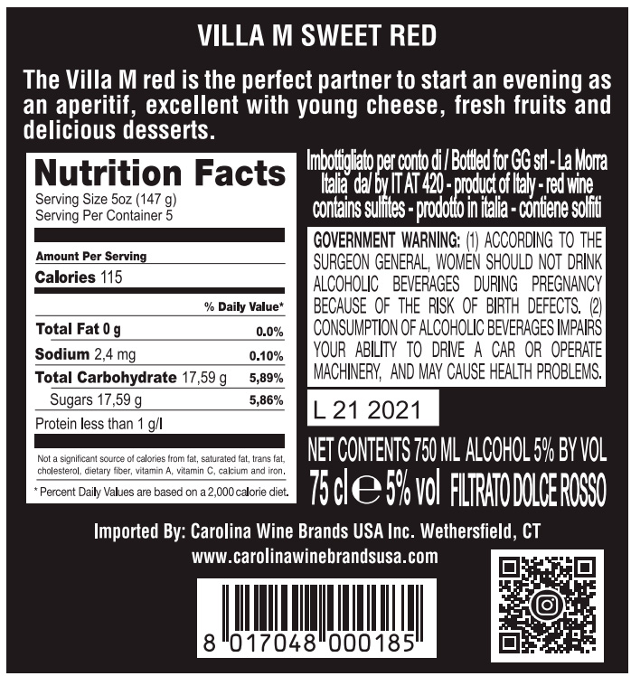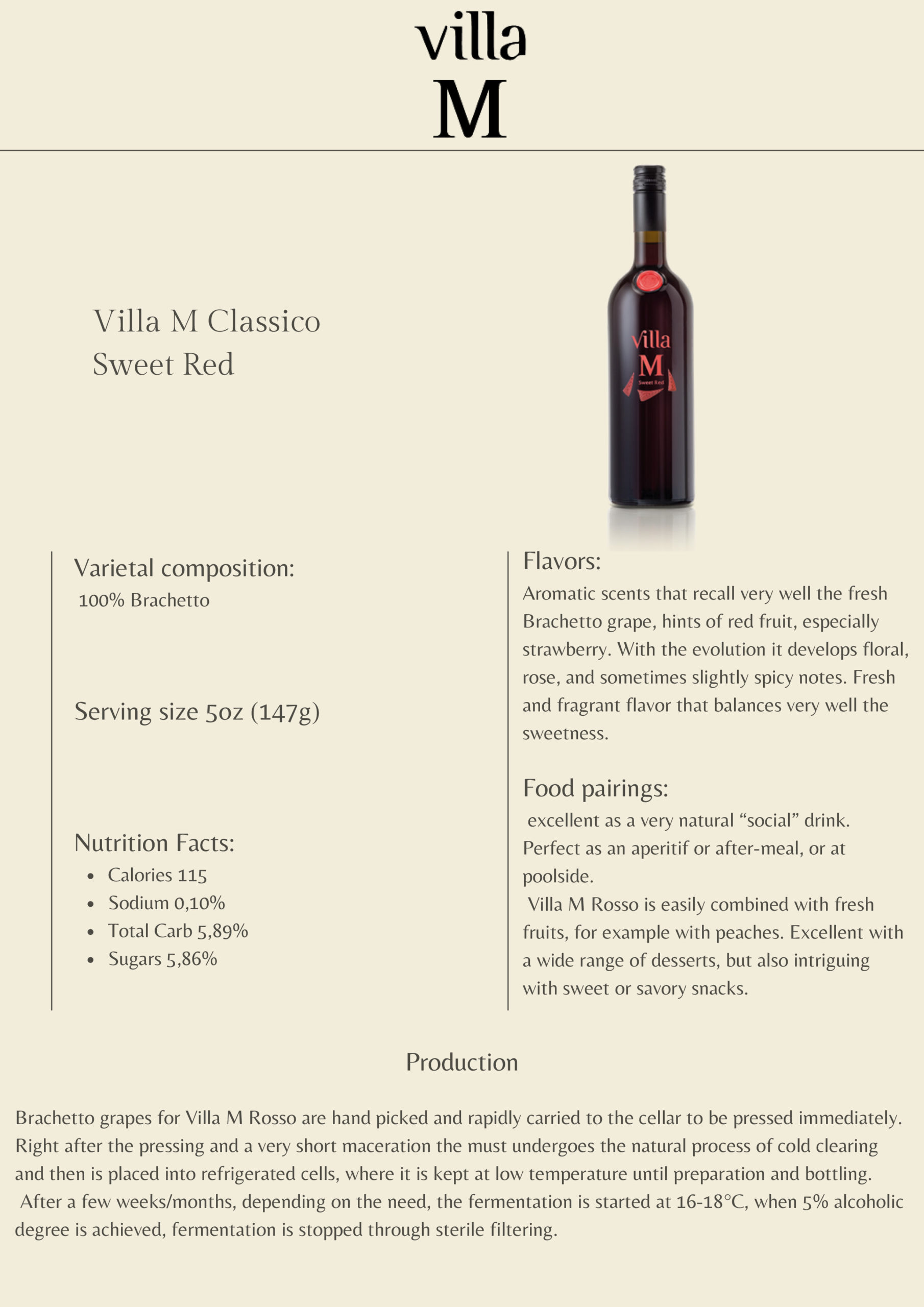 Villa M Classico Sweet Red is an expressive and aromatic wine made from 100% Brachetto. Bright notes of fresh strawberry and red fruits lead the nose, evolving into delicate floral aromas of rose with subtle spicy hints. Light, fragrant and well balanced, its natural sweetness is lifted by freshness, creating an easy-drinking red that is vibrant, social and irresistibly smooth.