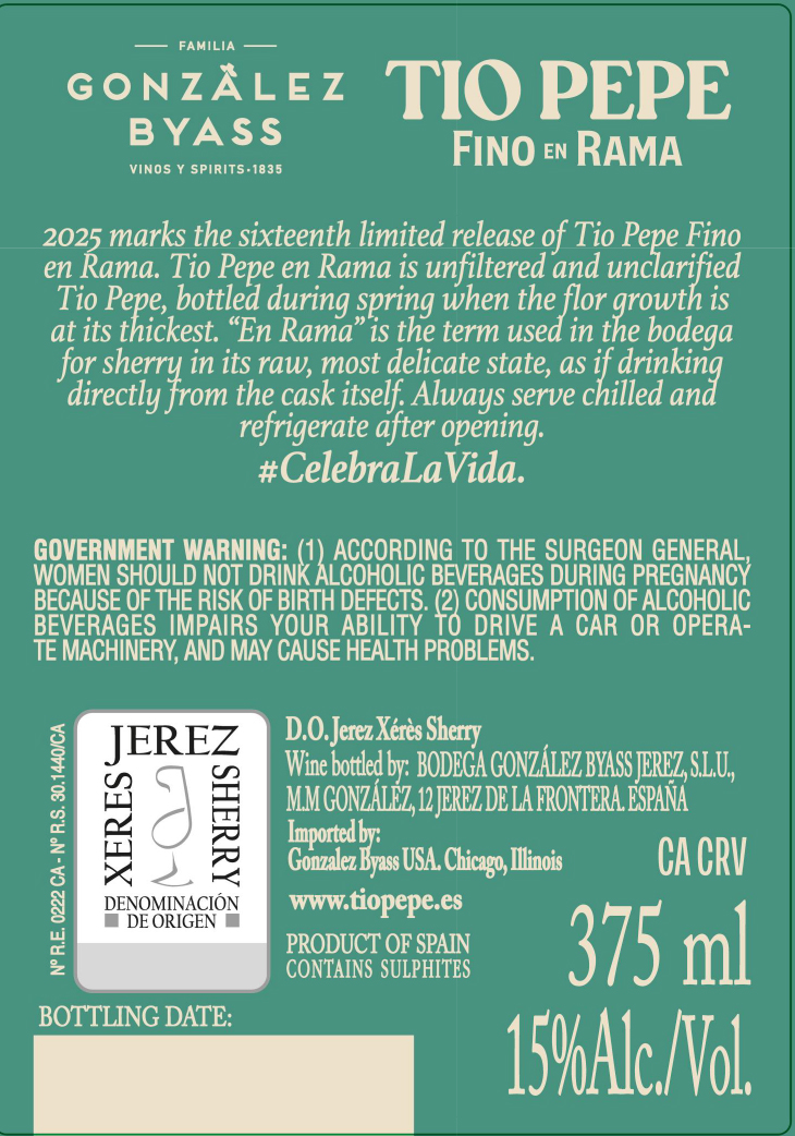 Tío Pepe en Rama is the purest expression of Fino: wild, unfiltered and shaped by the living veil of flor. Intense aromas of yeast, nuts and chalk lead to a fresh, saline and vibrant palate with depth and tension. A limited, authentic release that captures the soul of Jerez and the character of its historic soleras.