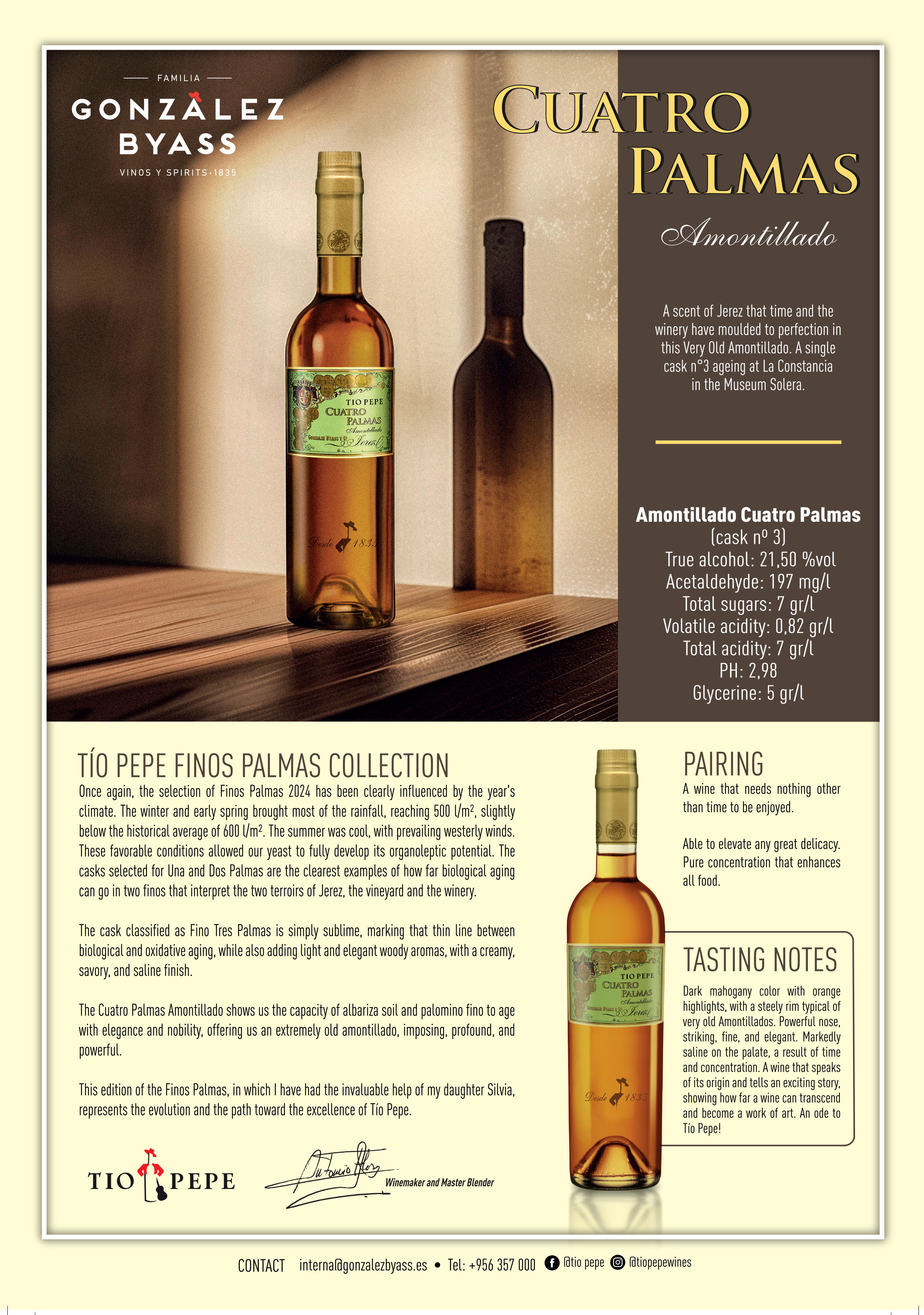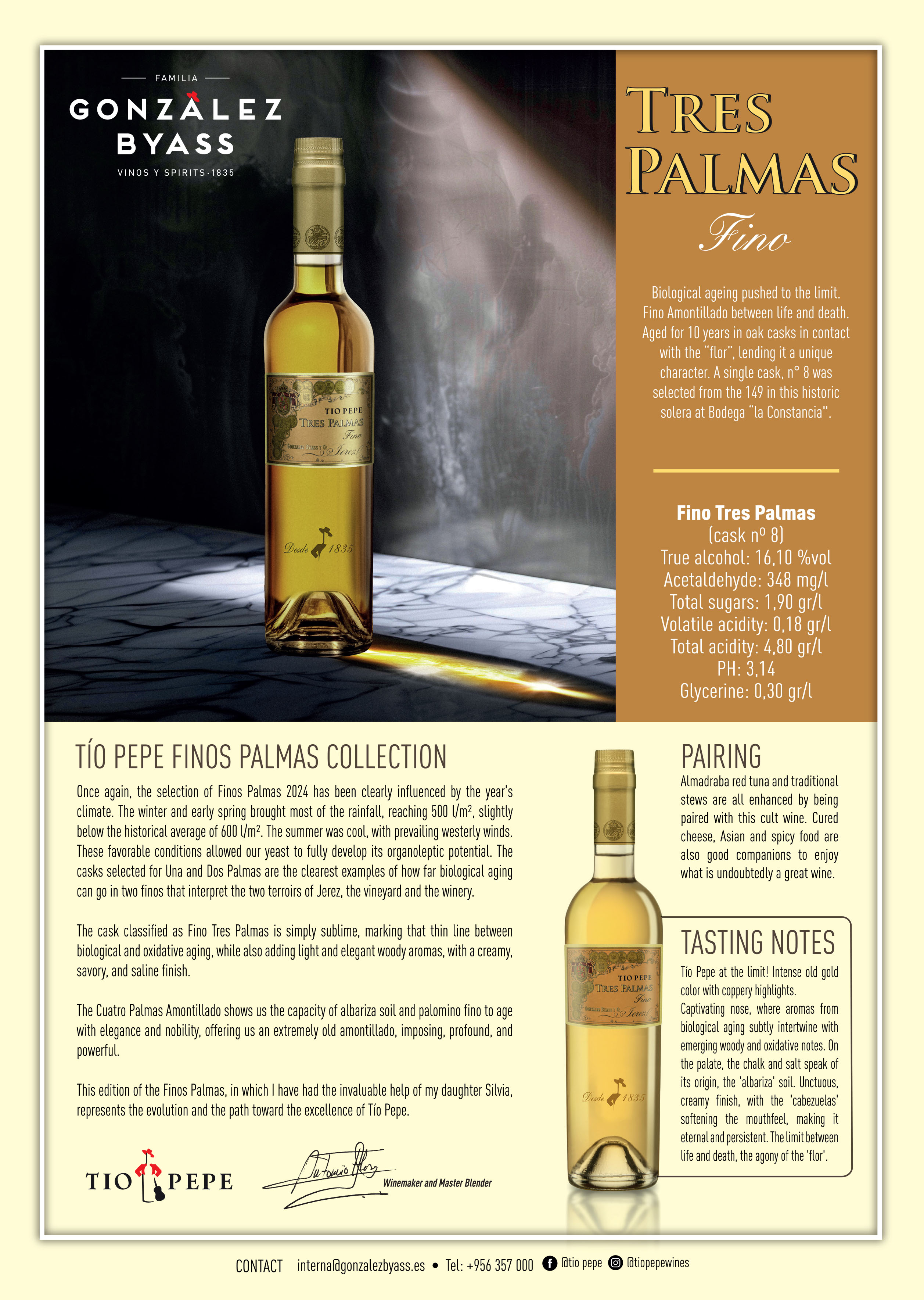 A Fino pushed to the limit, bordering on Amontillado. Aged for around ten years under flor, it offers intense old-gold colour, notes of nuts, exotic woods and deep saline character. Creamy, powerful and long on the palate, Tres Palmas stands at the edge between biological and oxidative aging.