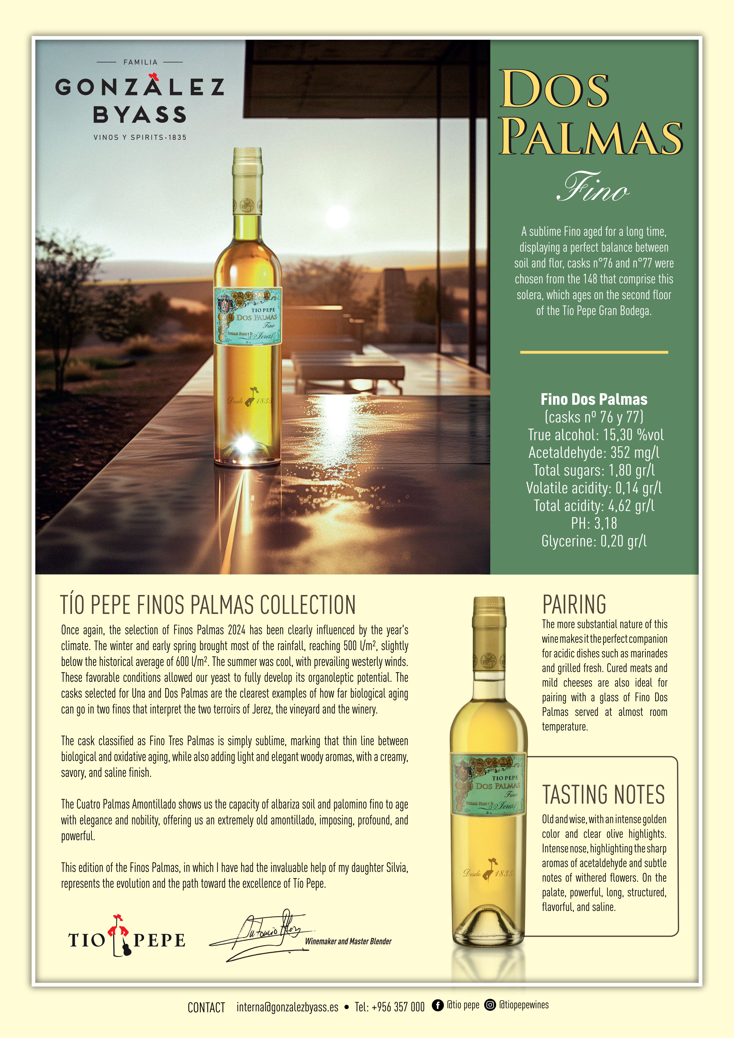 A long-aged Fino revealing perfect balance between vineyard, flor and time. Golden, expressive and structured, with deep aromas of dried flowers, acetaldehyde and subtle wood. Powerful, savoury and saline on the palate, Dos Palmas embodies the complexity and depth of an evolved Fino with exceptional harmony.