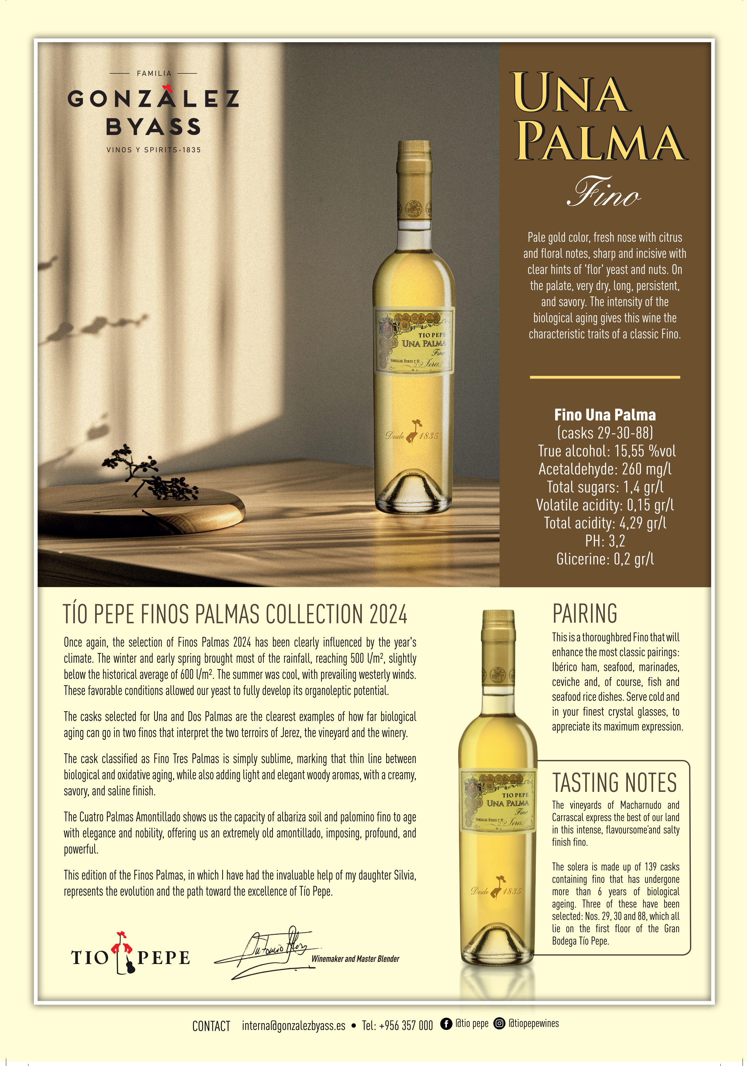 A pure, pale-gold Fino showing citrus, floral notes and the sharp precision of flor. Very dry, long and savoury, it reflects the clearest expression of biological aging. Elegant, intense and saline, Una Palma highlights the character of the finest vineyards of Jerez with remarkable finesse and persistence.
