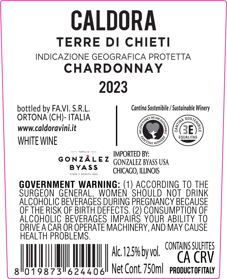 Caldora Chardonnay Terre di Chieti IGT expresses the bright, Mediterranean side of Abruzzo. Grown on calcareous clay soils near the Adriatic coast, this 100% Chardonnay is hand harvested and fermented at low temperature to preserve freshness and aromatics. Straw yellow in color, it offers notes of tropical fruit and ripe citrus. On the palate it is balanced, smooth and persistent, with a clean, refreshing finish. Ideal as an aperitif or paired with fish, white meats and light dishes.