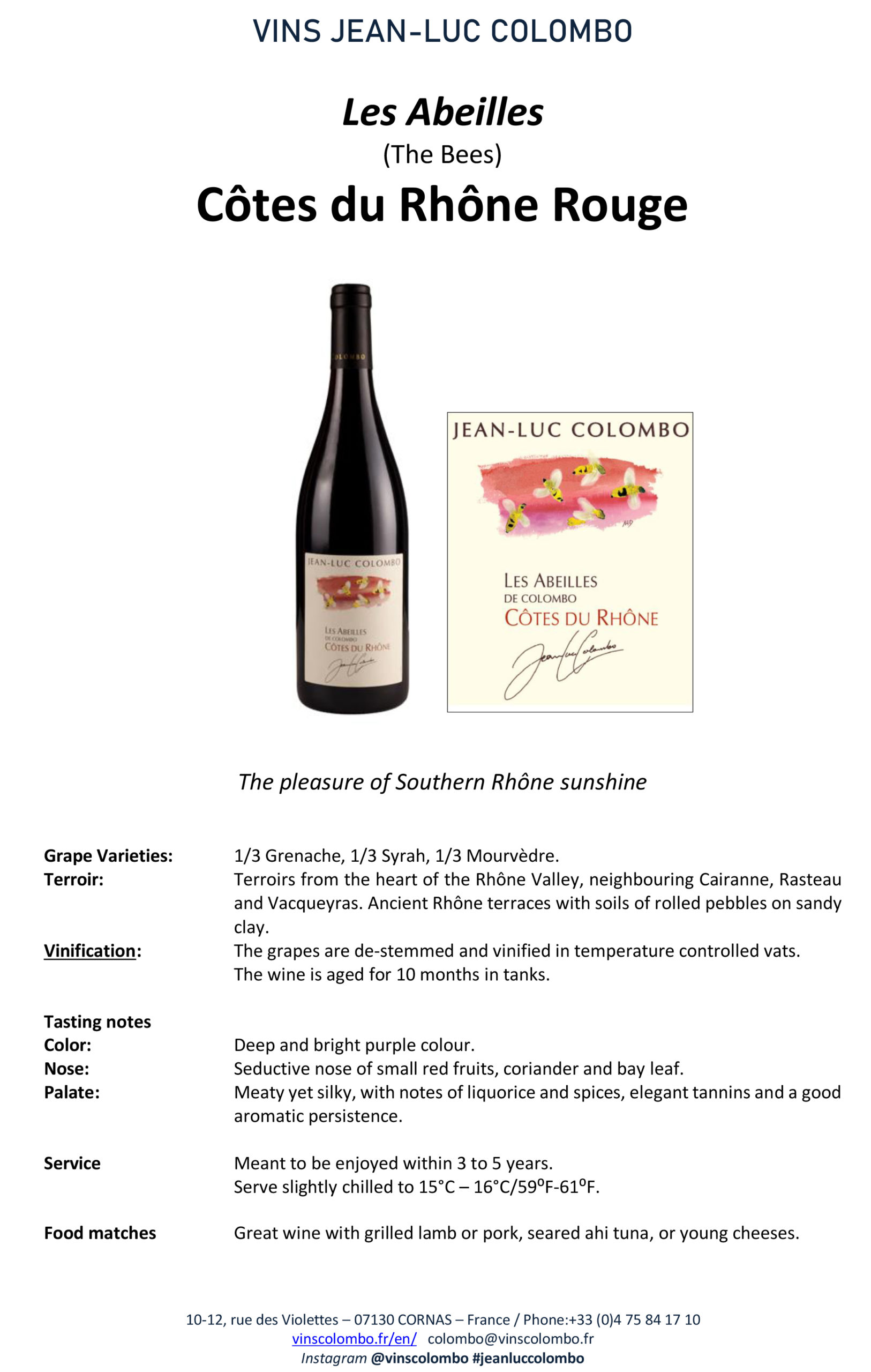 Les Abeilles Rouge captures the warmth and generosity of the Southern Rhône. Crafted by Jean-Luc Colombo from equal parts Grenache, Syrah and Mourvèdre, it comes from ancient Rhône terraces of rolled pebbles and sandy clay. Deep purple in colour, the wine reveals aromas of red berries, coriander and bay leaf. The palate is silky yet structured, with notes of spice and liquorice, elegant tannins and a long, aromatic finish.
