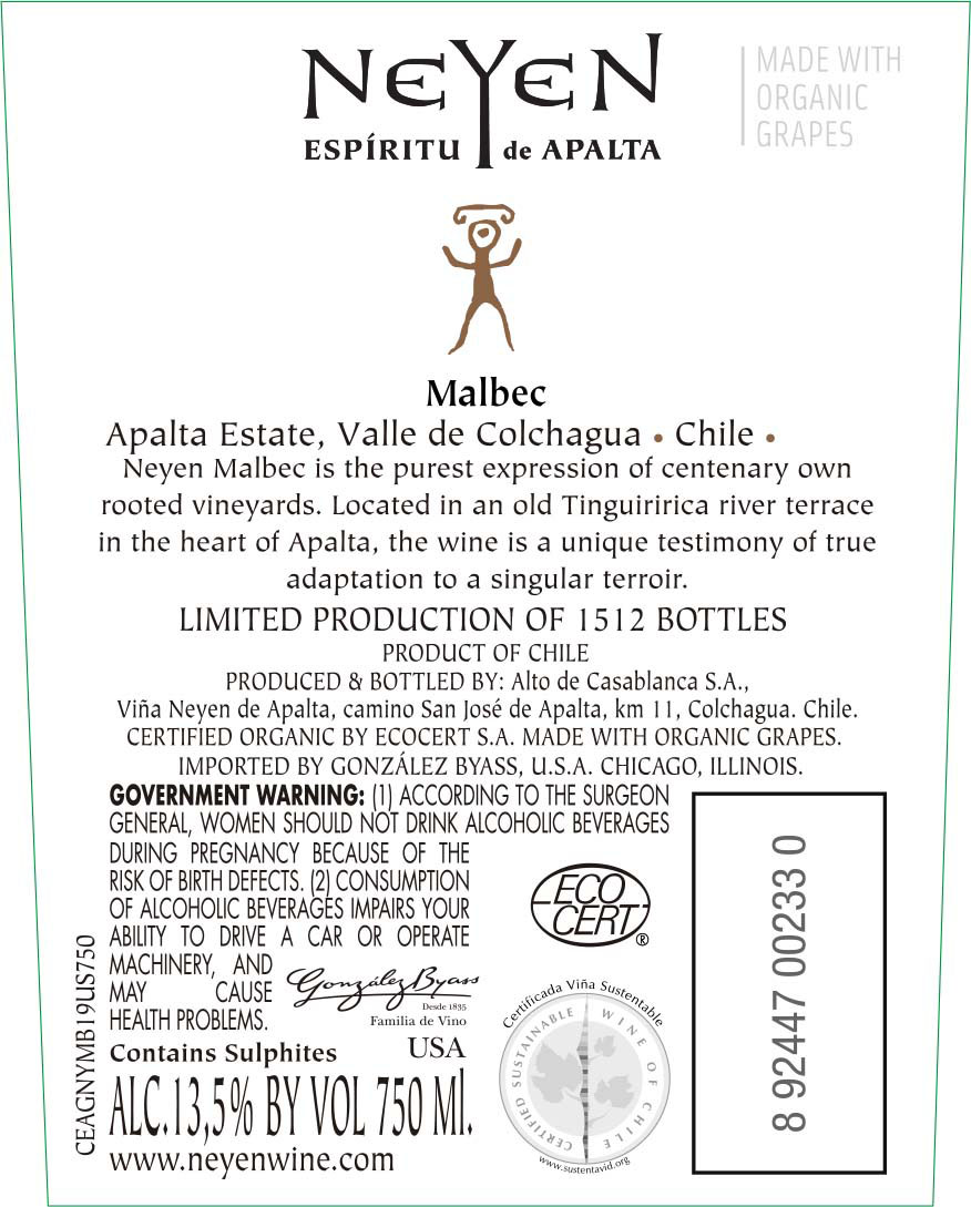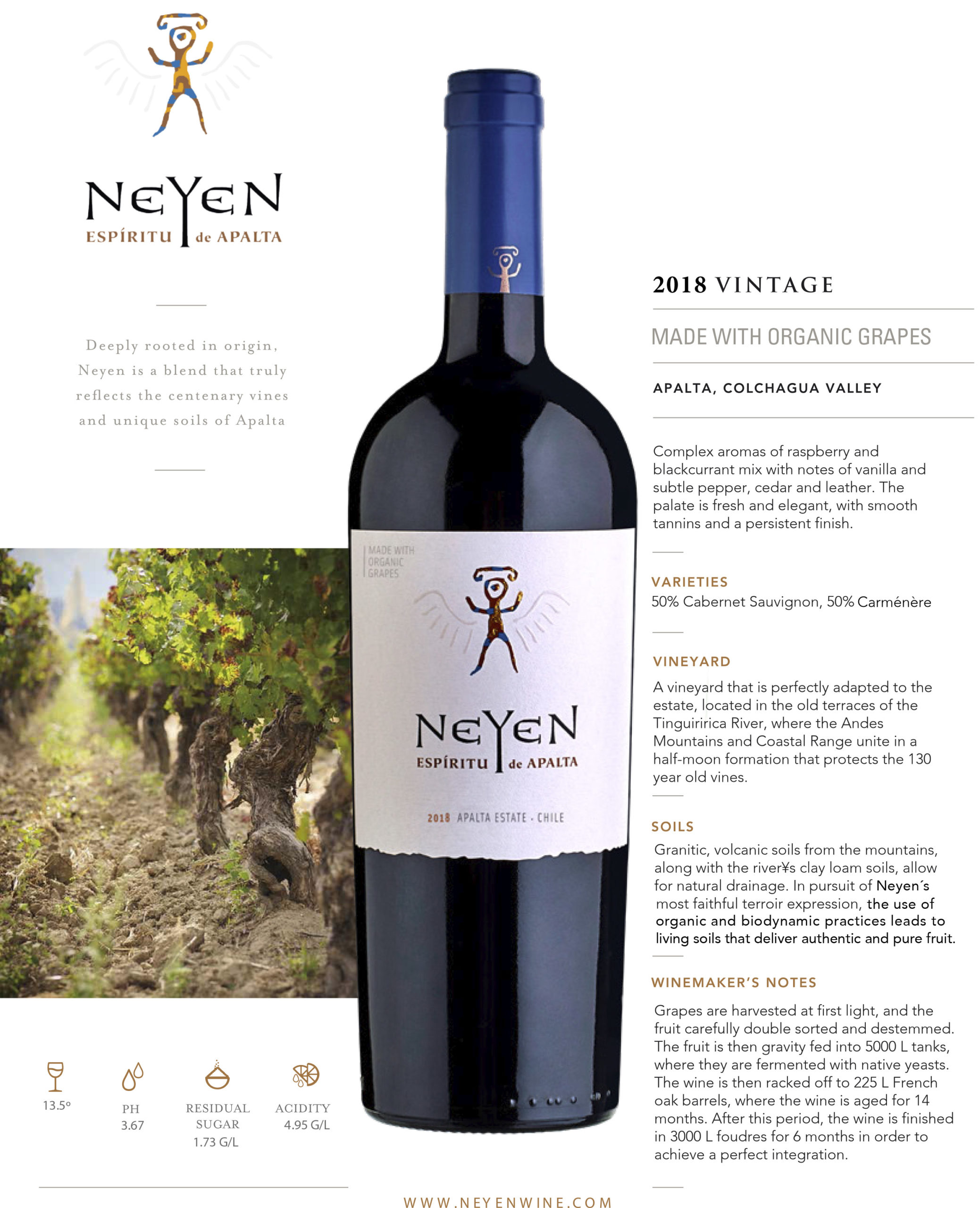 Neyen Malbec Limited Edition is an organic wine from Apalta, crafted from old vines that express the elegance and depth of this historic terroir. Aromas of black fruits, plums and cherries intertwine with delicate notes of spice and violet. The palate is structured and expressive, with ripe tannins, balanced acidity and a long, refined finish that reveals personality, complexity and remarkable aging potential.