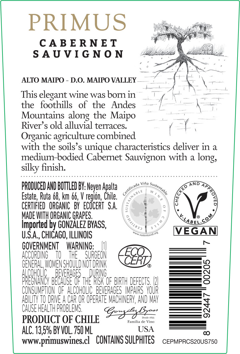 Primus Cabernet Sauvignon is an organic wine from Alto Maipo that expresses the elegance and strength of this iconic Andean terroir. Aromas of blackberry, blueberry and dried cherry are layered with notes of vanilla and cedar. The palate is smooth and silky, with fine tannins, balanced acidity and excellent structure. A slow ripening process delivers depth, freshness and a long, refined finish that reflects the mineral character of the Maipo soils.