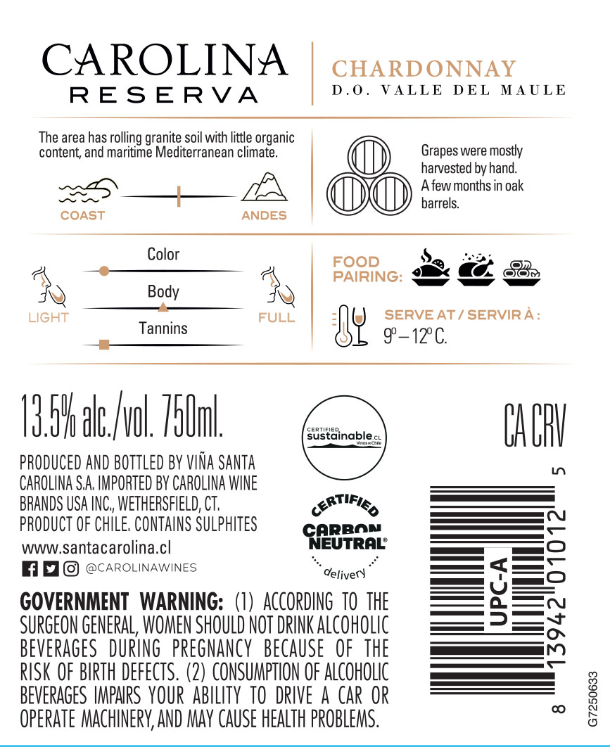 Carolina Reserva Merlot expresses the character of the Maule Valley through a bright ruby-red color and a refined, fruit-driven profile. Aromas of raspberry and sour cherry lead the nose, followed by subtle notes of sweet spices, cinnamon and tobacco. On the palate, it is smooth and well-balanced, with fresh acidity and gentle yet firm tannins that deliver a lingering, elegant finish.