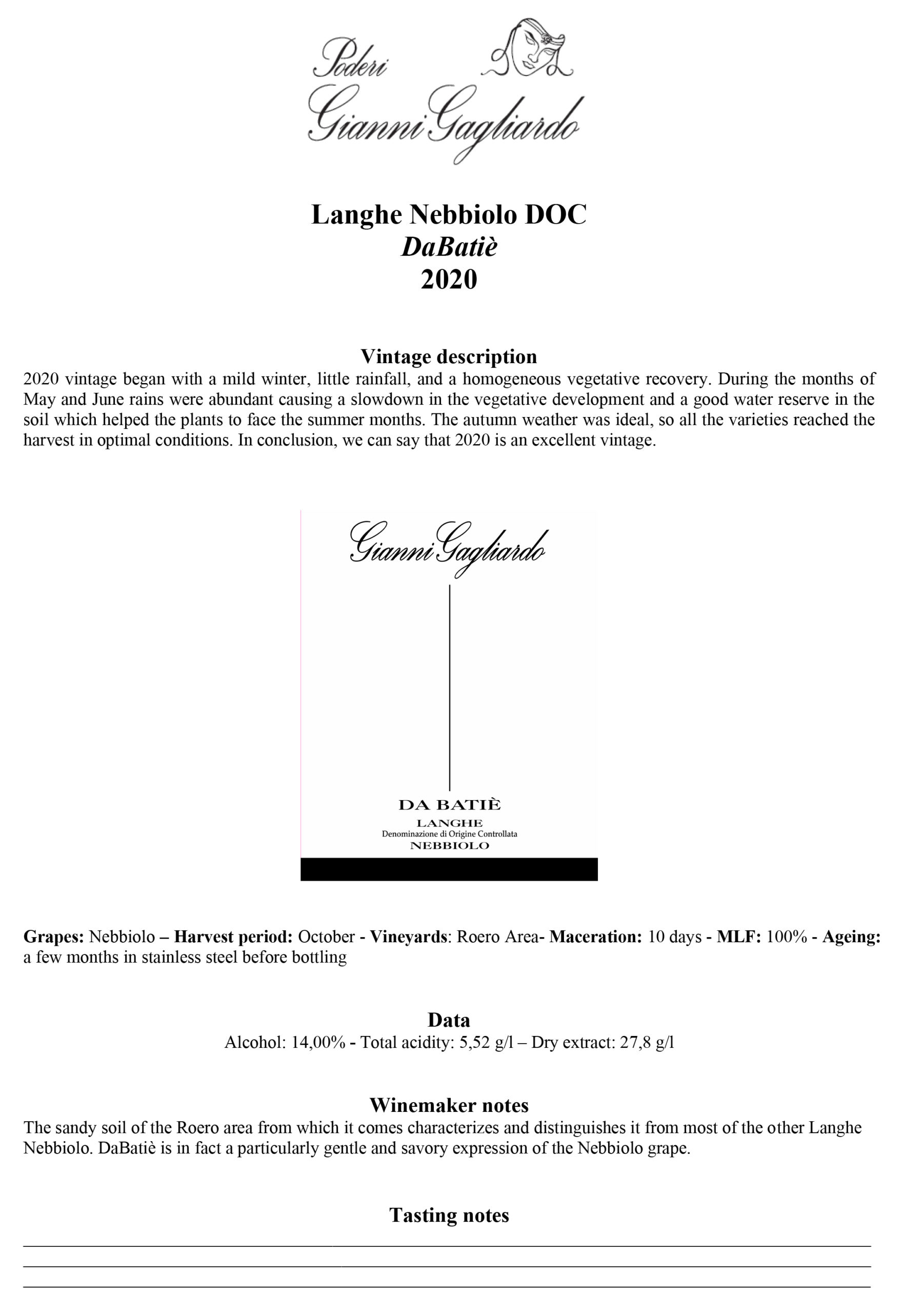 Da Batiè is a refined and approachable expression of Nebbiolo from the sandy soils of the Roero area, which lend elegance and softness to the grape’s naturally firm character. Harvested in October and vinified with a short maceration, it is aged briefly in stainless steel to preserve purity and freshness. The result is a gentle, savory Nebbiolo, balanced and expressive, offering clarity, finesse and immediate drinkability without losing varietal identity.