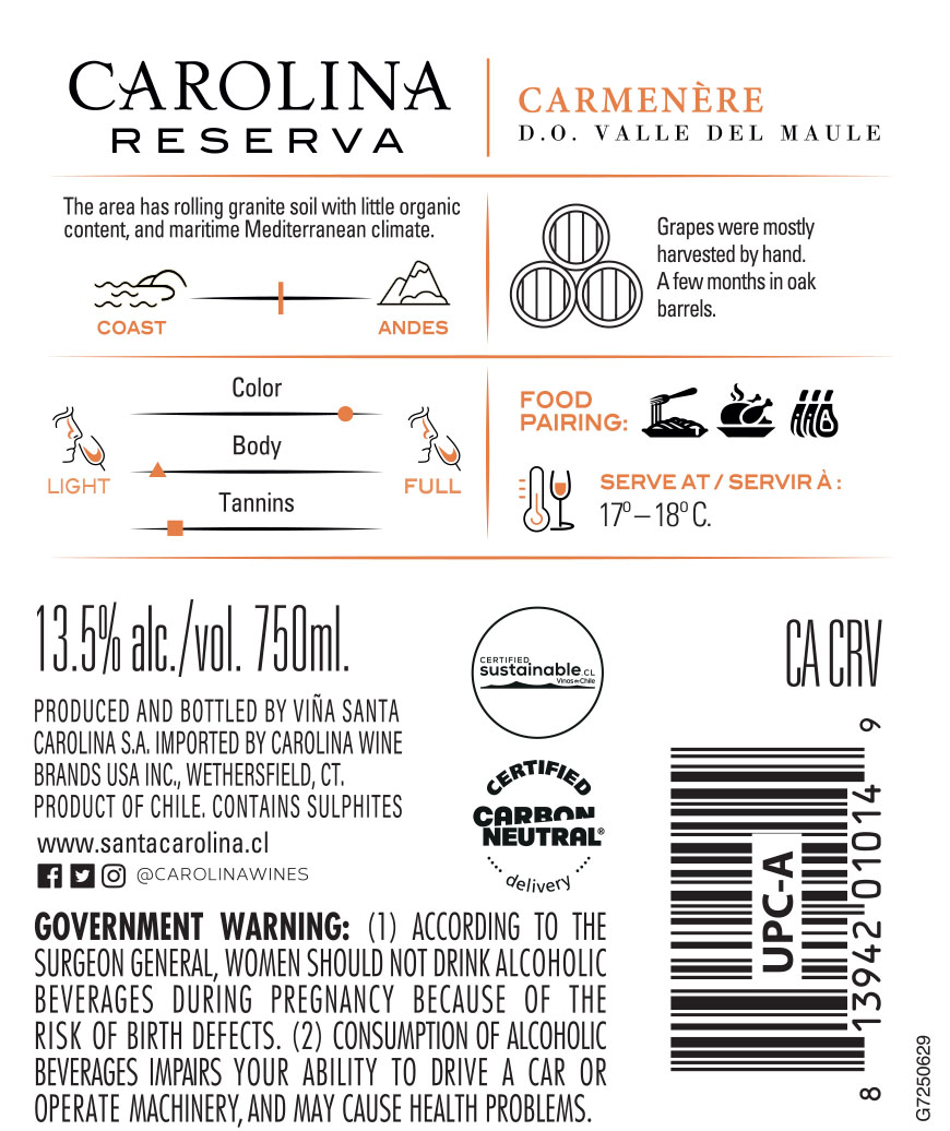 Carolina Reserva Merlot expresses the character of the Maule Valley through a bright ruby-red color and a refined, fruit-driven profile. Aromas of raspberry and sour cherry lead the nose, followed by subtle notes of sweet spices, cinnamon and tobacco. On the palate, it is smooth and well-balanced, with fresh acidity and gentle yet firm tannins that deliver a lingering, elegant finish.