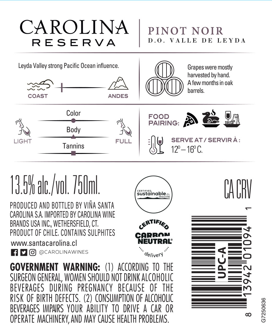 From Chile’s cool-climate Leyda Valley, this Pinot Noir shows a bright ruby red color and expressive aromas of cherry and raspberry, with subtle notes of dried herbs and moist earth. The palate is elegant and well-balanced, featuring fresh acidity and fine, silky tannins that build a refined structure. Lively red fruit flavors and a delicate underbrush character lead to a smooth, persistent finish with great finesse.