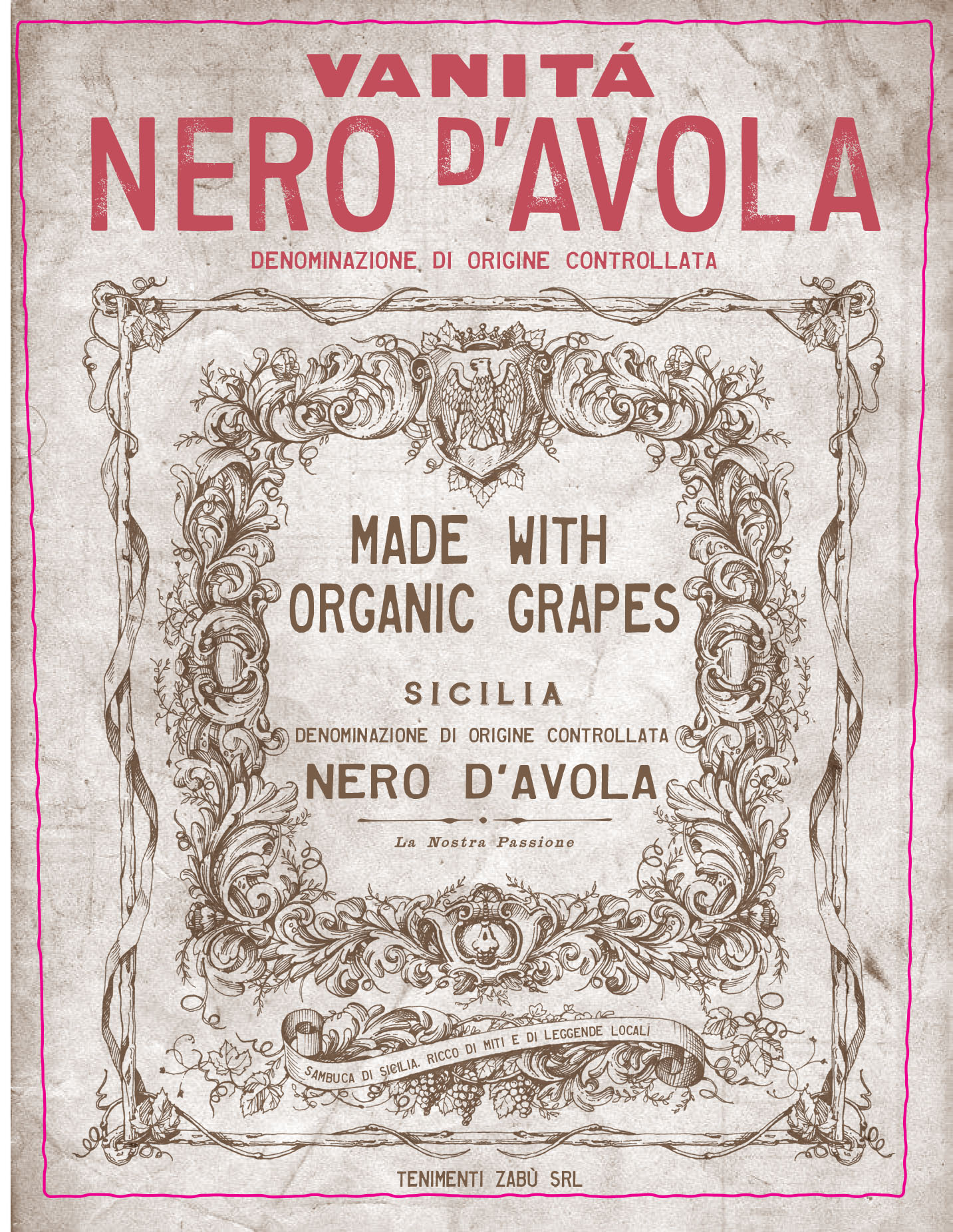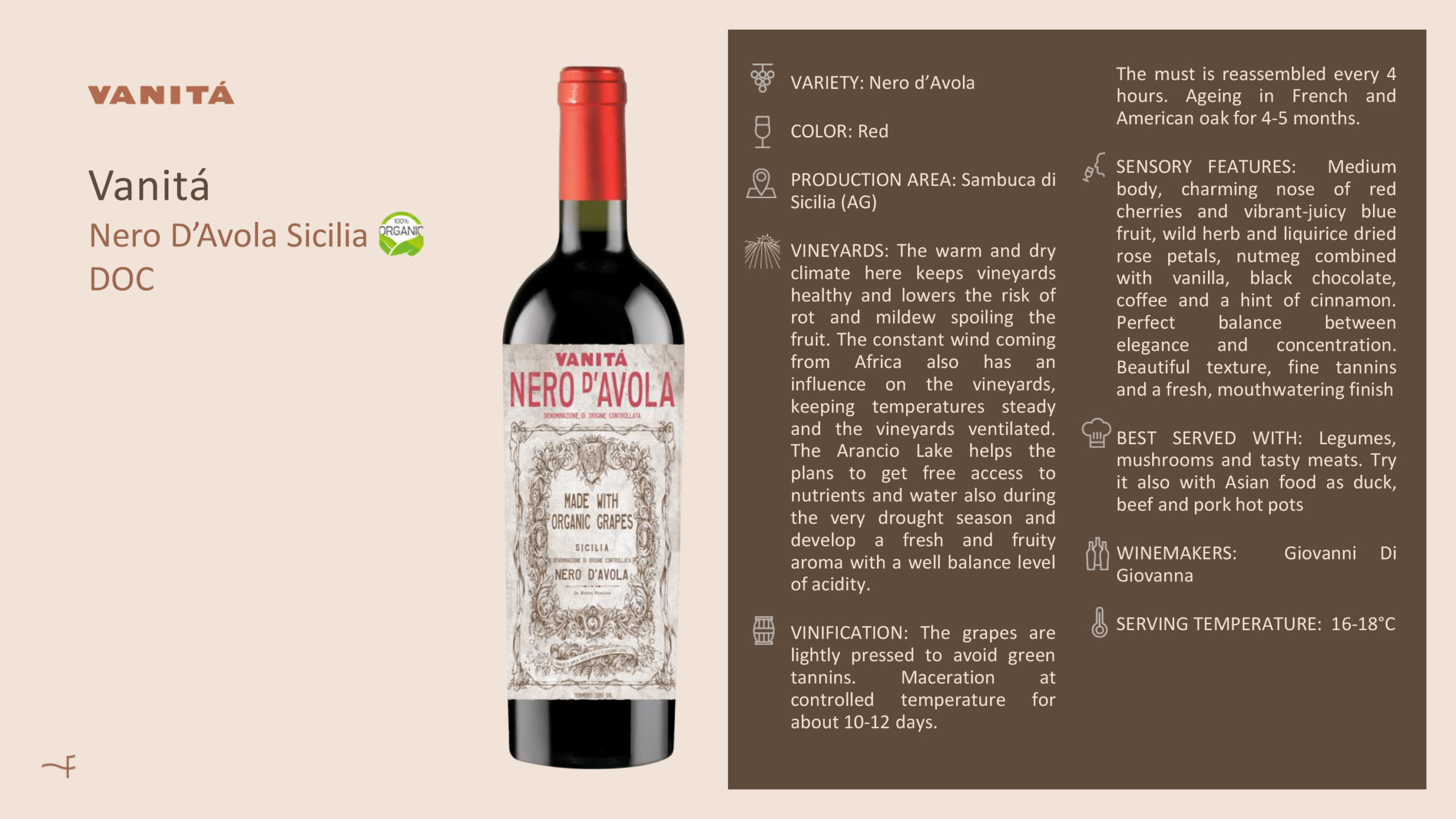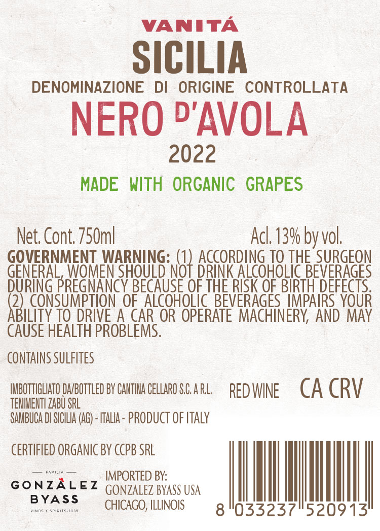 Vanità Nero d’Avola Sicilia DOC is an organic red wine from the warm, sunlit vineyards of Sambuca di Sicilia. Medium-bodied and expressive, it reveals aromas of red cherries, juicy blue fruit, wild herbs and dried rose petals, enriched by notes of vanilla, chocolate, coffee and spice. Smooth and well balanced, with fine tannins and fresh acidity, it pairs beautifully with legumes, mushrooms and flavourful meat dishes.