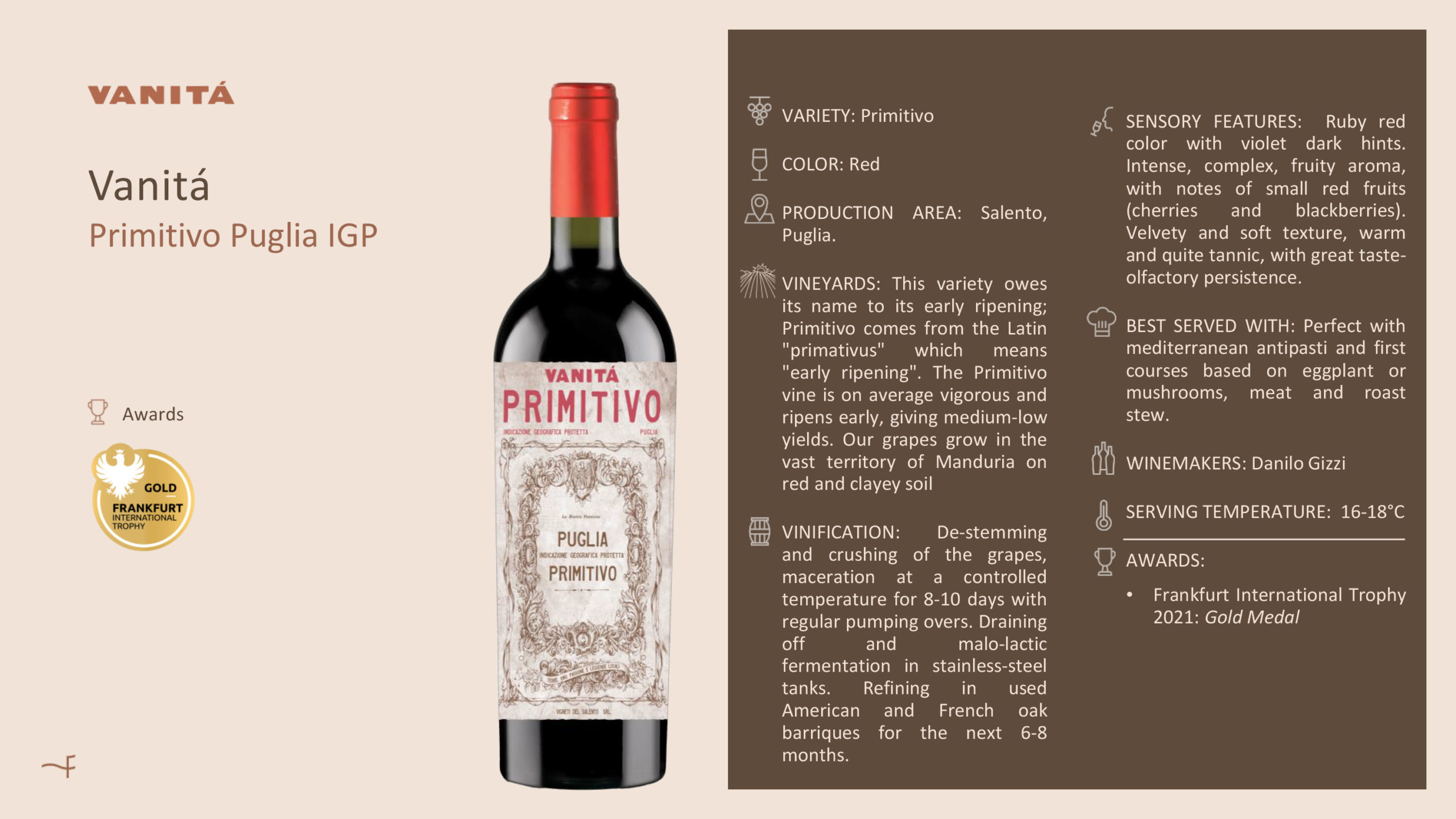 On the Adriatic coast in Abruzzo, Vanità highlights the Pecorino grape: bright straw yellow in the glass, with aromas of pear, apple and peach, a hint of florals and subtle minerality. Part of the wine is aged in oak to add depth while retaining fresh vitality. In Puglia, the Negroamaro and Primitivo expressions display dark fruit intensity, hints of dried herbs, bramble-berries and a warm southern temperament.