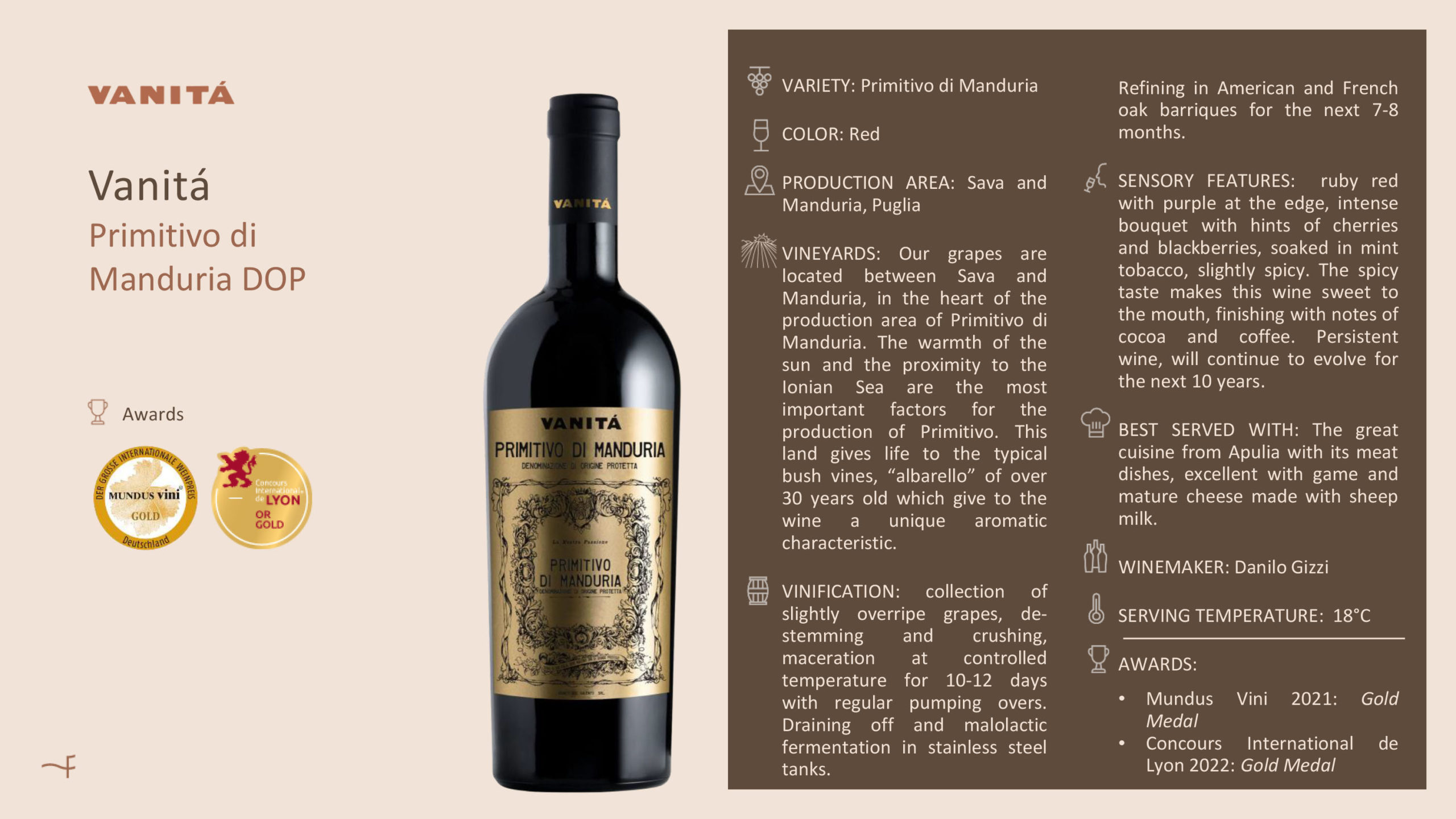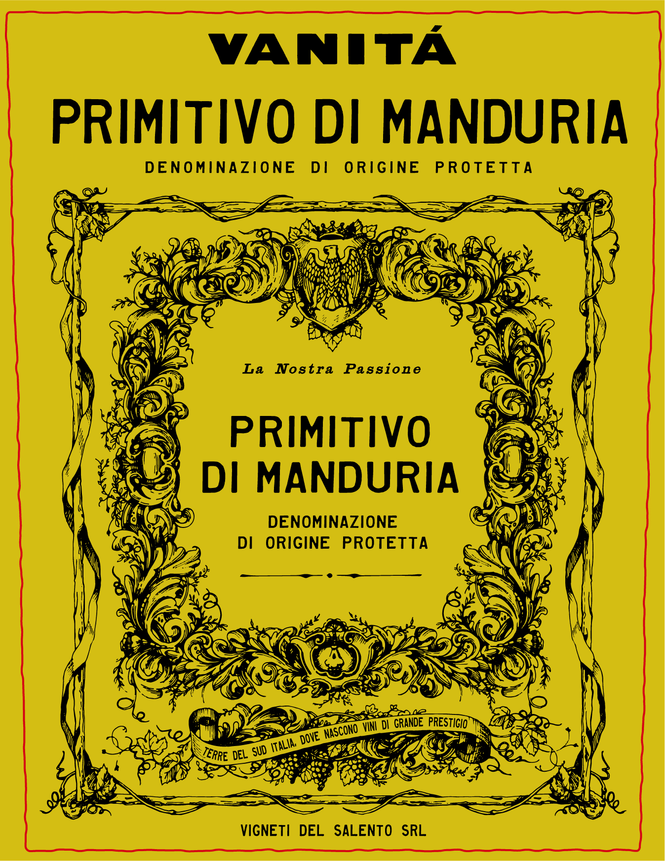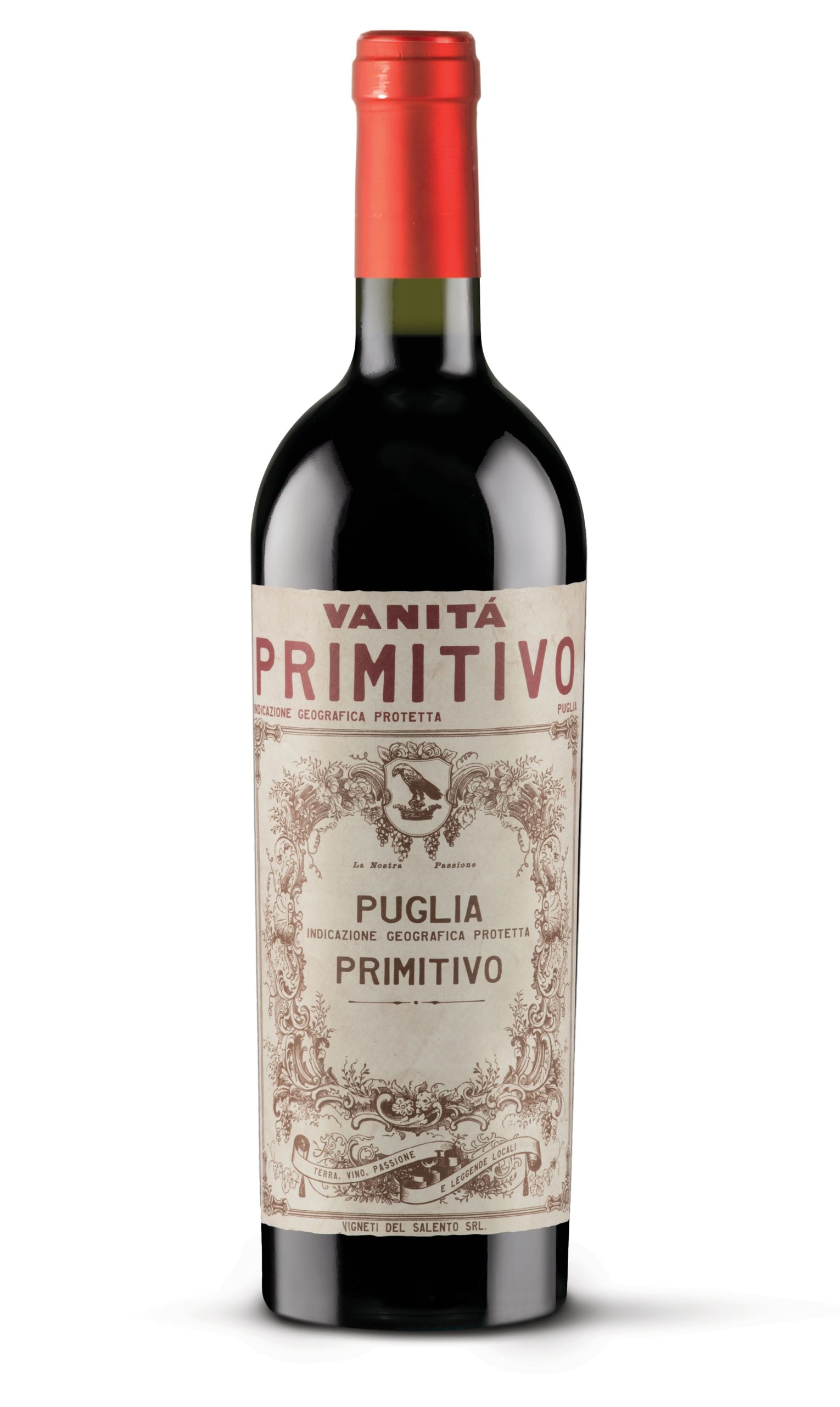 Vanità Primitivo di Manduria DOP is a powerful and elegant red wine from the heart of Puglia, sourced from old bush-trained vineyards between Sava and Manduria. Deep ruby with purple hues, it offers intense aromas of cherries and blackberries layered with mint, tobacco and subtle spice. Rich and velvety on the palate, it finishes with notes of cocoa and coffee and shows great ageing potential. Ideal with Apulian meat dishes, game and mature cheeses.