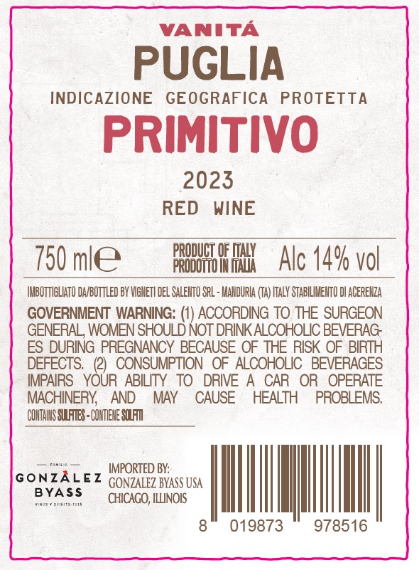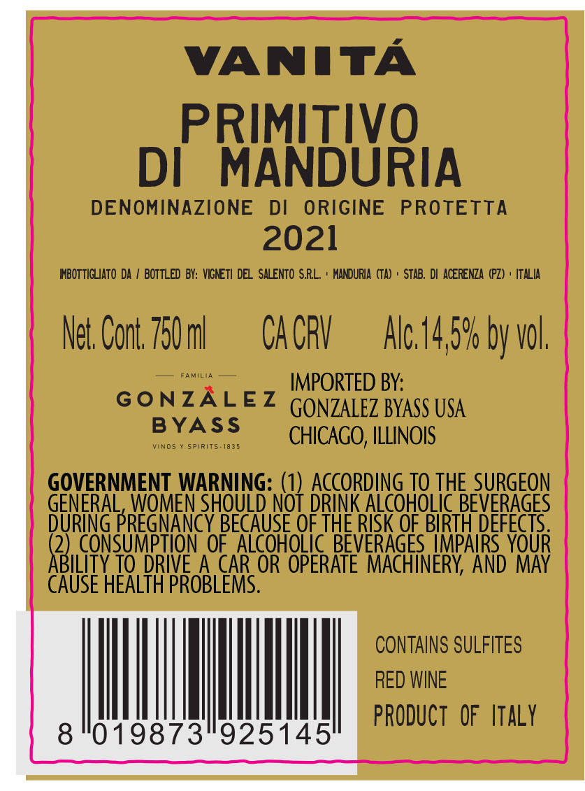 Vanità Primitivo Puglia IGP is an intense and expressive red wine from Salento. Ruby red with violet hues, it offers a complex and fruity bouquet of cherries and blackberries. On the palate it is velvety, warm and softly tannic, with great aromatic persistence. Vinified with controlled maceration and aged in American and French oak, it pairs beautifully with Mediterranean dishes, roasted meats and rich stews.